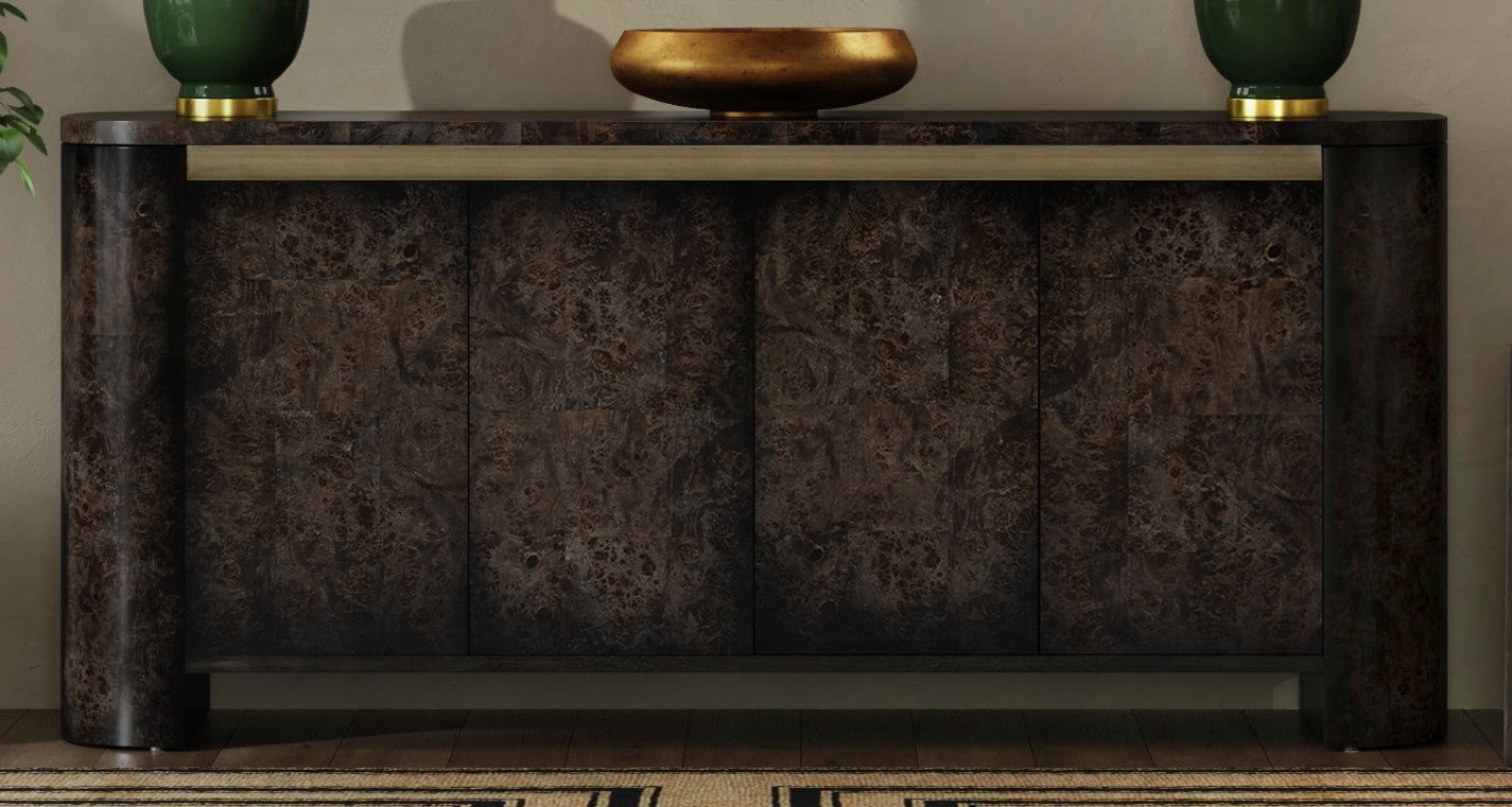 - Solid wood construction with olive ash burl veneers in a rich black stain