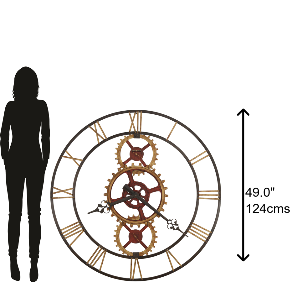 - s the details that set this metal wall clock apart. Take in the fixed inner gears finished in antique brass and accented by red centers dusted in black. Both the top and bottom gears feature mobile seconds hands finished in antique brass. Surrounding the inner gears is a rich gray frame made up of inner and outer rings. Together they support applied antique gold-finished Roman numerals, while the warm gray hour and minute hands complement the design. Easy Assembly: A steampunk wall clock like this is a standout&mdash