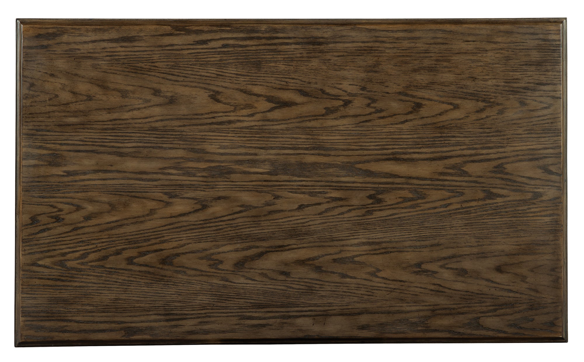 - Coffee table of oak veneer and mindi solids with 1-3/4" rectangular slab oak top with inset molded top edge.