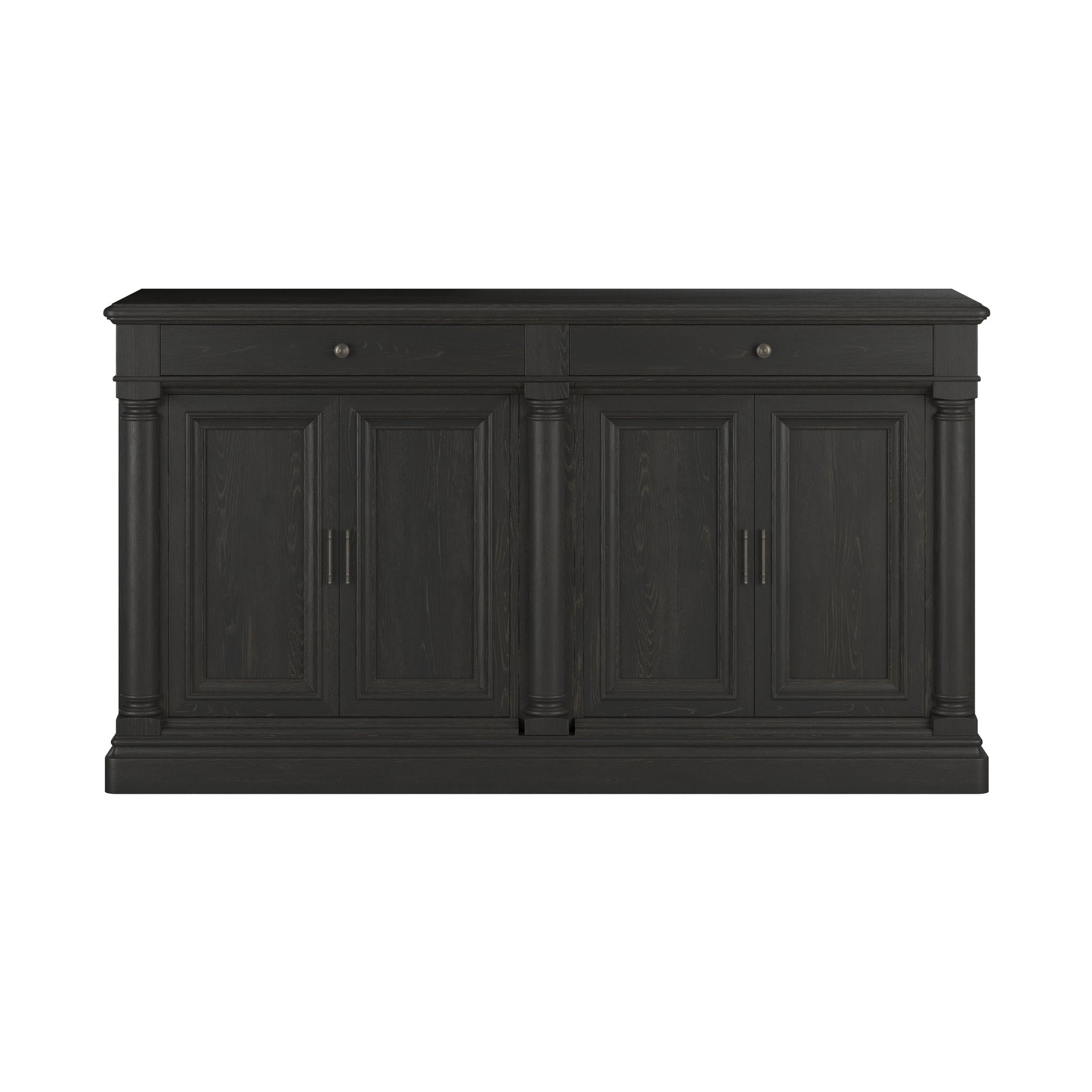 The generously proportioned Atrium Buffet measures 84 inches long, including two drawers and two cabinets with adjustable shelves. The top is made of honed black granite, and cabinet and drawer fronts are accented with traditional paneling and cylindircal column motifs, finished with the rich patina of oil rubbed bronze hardware.