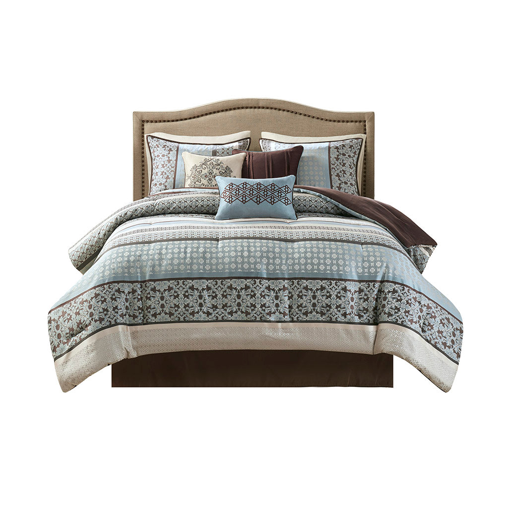 Refresh your bedroom with a refined, layered look that blends geometric precision and classic damask motifs. This seven-piece set pairs textured jacquard with a brushed reverse for a soft, inviting feel, and includes coordinated decorative pillows to complete a polished, designer-ready bedscape.