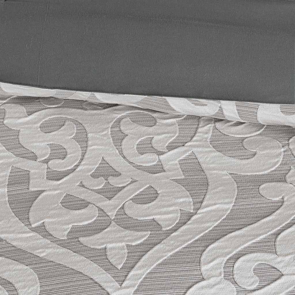 - Design: Damask medallion jacquard pattern with subtle silver striations on a satin ground for depth and a luxe finish; solid grey reverse for versatile styling.
