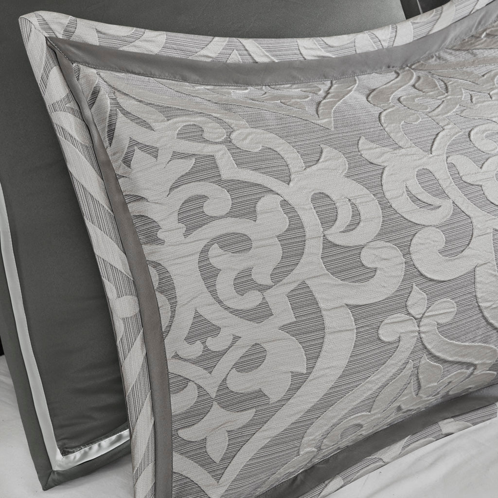 Elevate your bedroom with the Madison Park Odette 8-piece jacquard comforter set — a refined blend of textured jacquard, luxurious satin highlights, and tailored accents that create a sophisticated, hotel-inspired look. Designed for both visual impact and cozy comfort, this ensemble delivers layered styling with decorative details and easy-care construction.