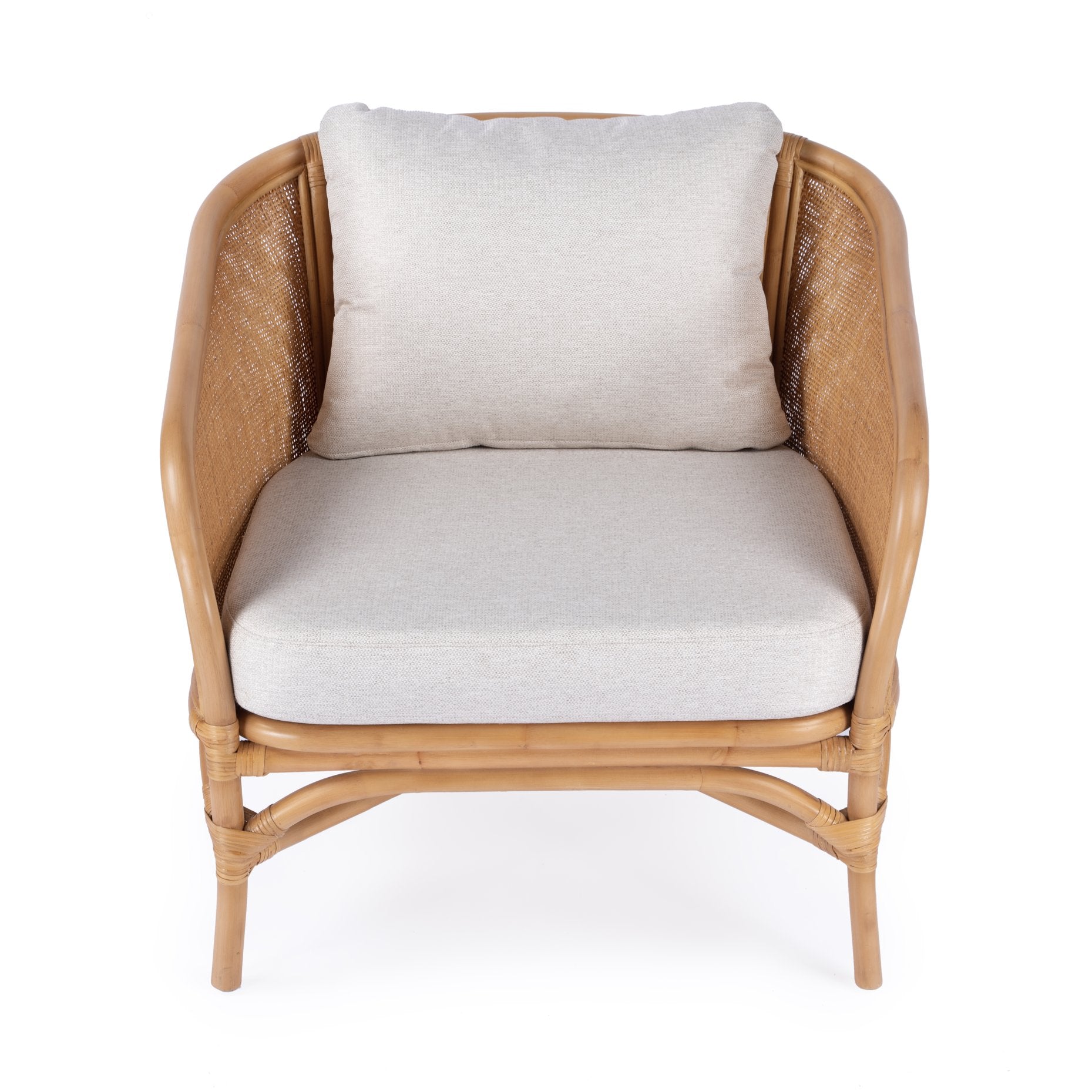 - Product Features (Construction Details): Rattan pole frame featuring rattan split woven around joints and features a naturally woven rattan seat back with an upholstered seat and back cushion