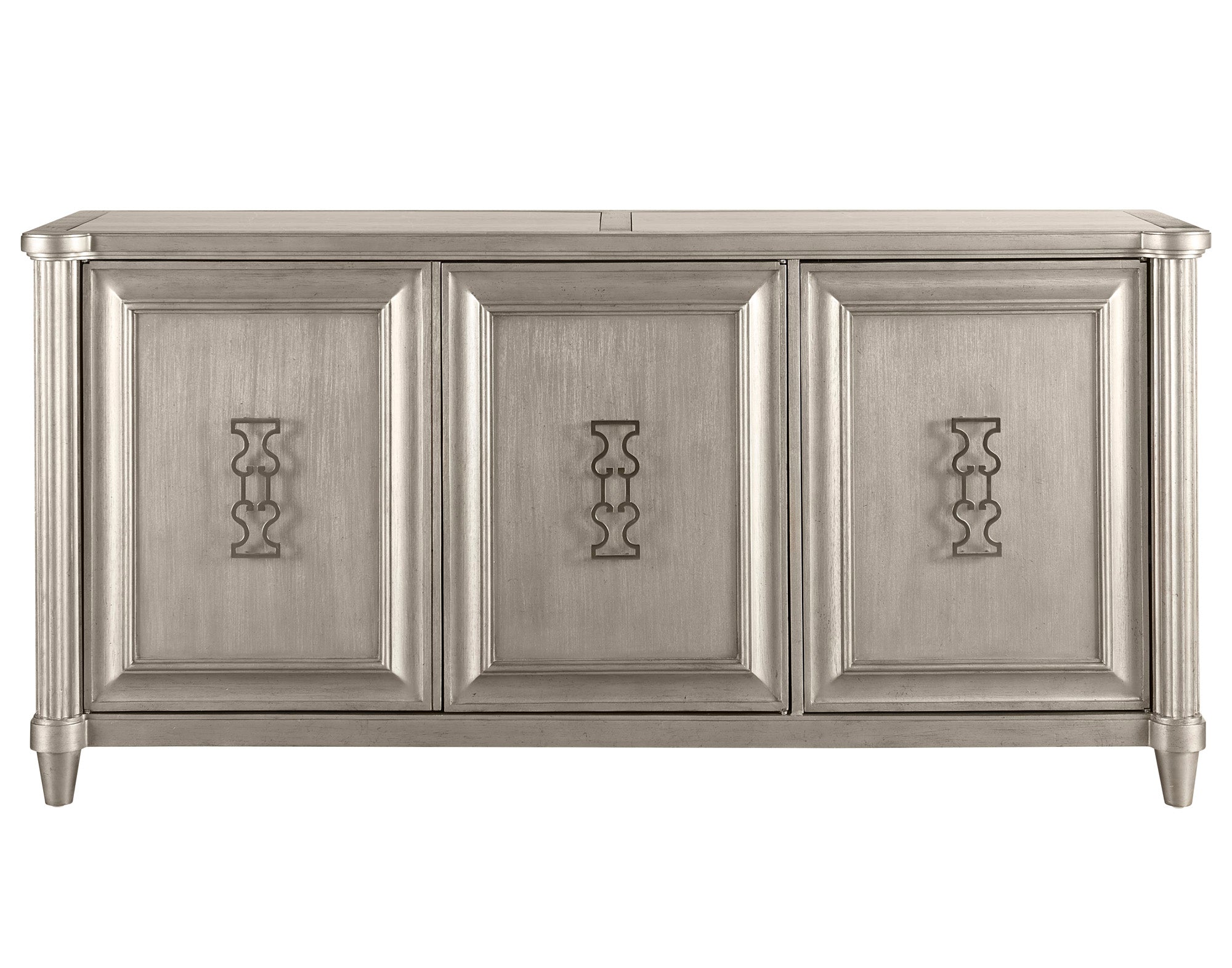 - Lyre inspired metal hardware in a brushed nickel finish