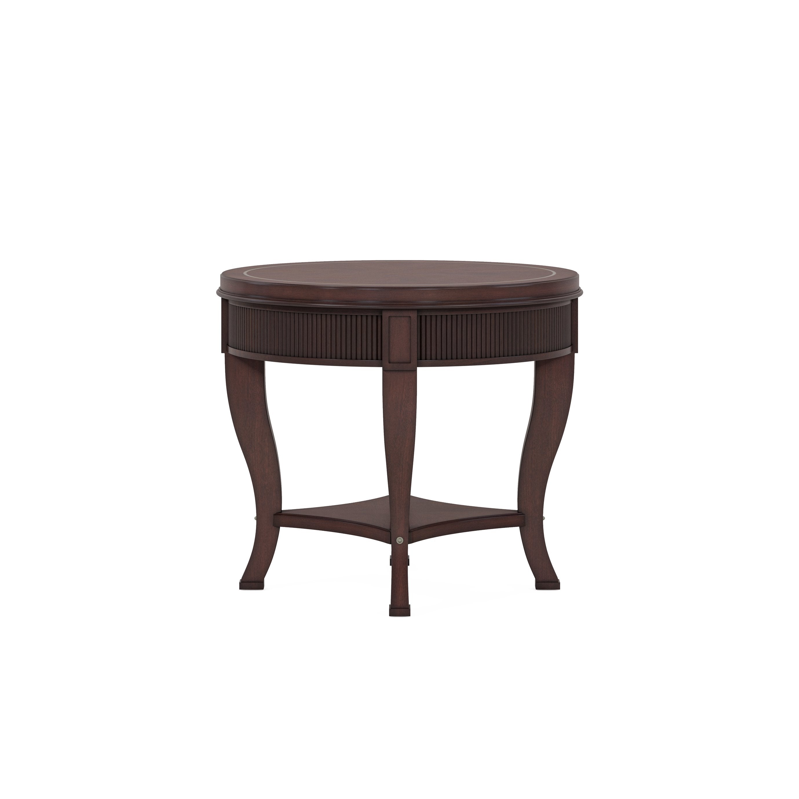 - Round top features swirl mahogany veneers and contrasting satin wood inlay