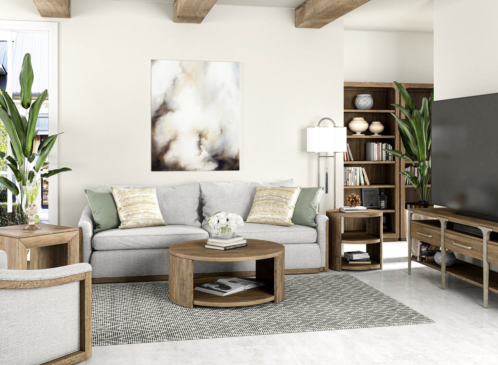 Bring the drama with a collection defined by boldly simple forms that reflects the aesthetic of a global traveler. Hefty wood in an oiled oak style is angular and eye-catching, accented by subtly arched details reminiscent of doorways around the world that lead to mystery and intrigue. This look honors natural materials with a knotty, highly visible wood grain highlighted by subtle metallic finishes and finely tailored upholstery, for a look that’s equal parts eclectic and chic.