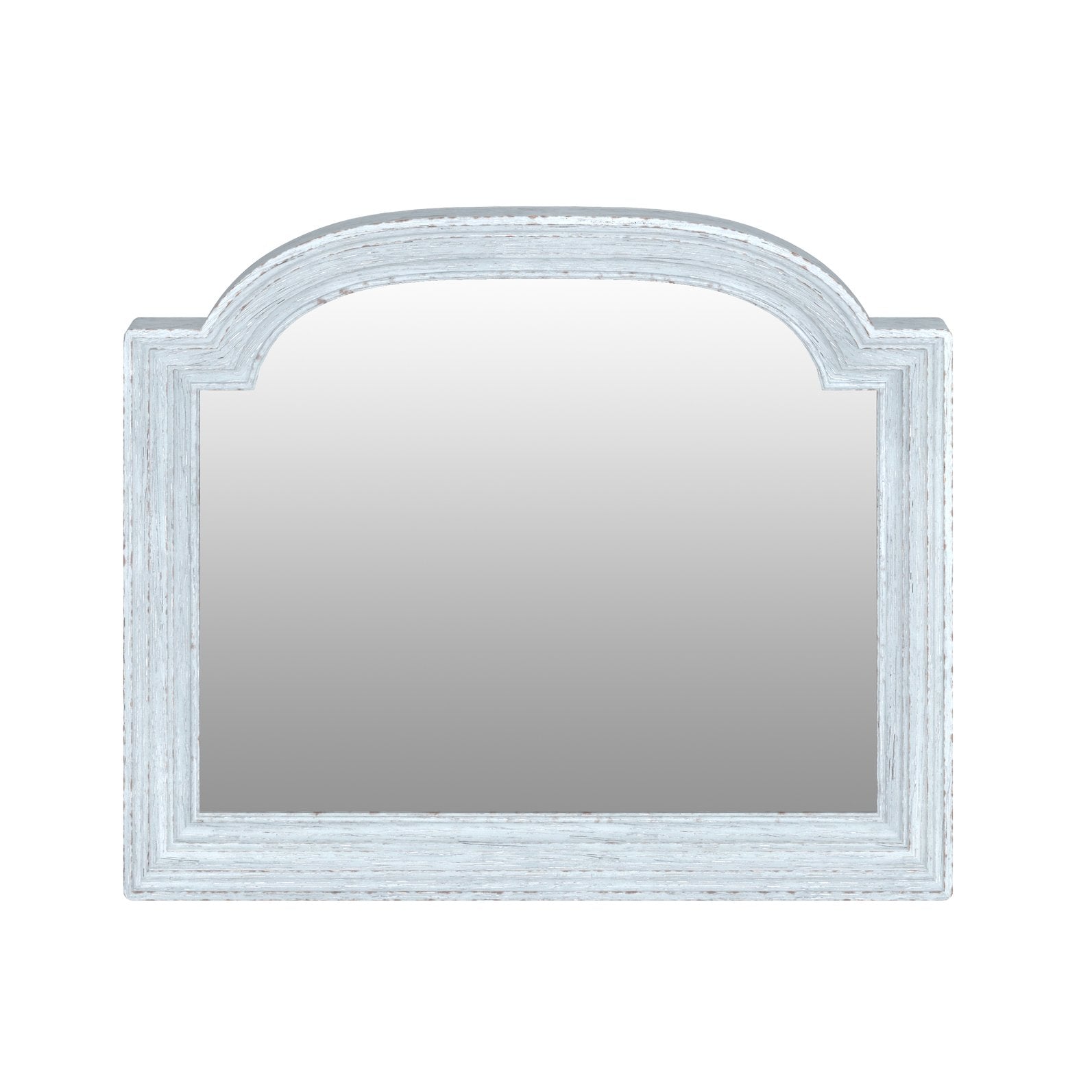 - Mirror features beveled edges, Constructed of expertly mitred cove molding, The oak frame is in a light distressed blue painted finish with rich tones of wood visible thru worn surfaces