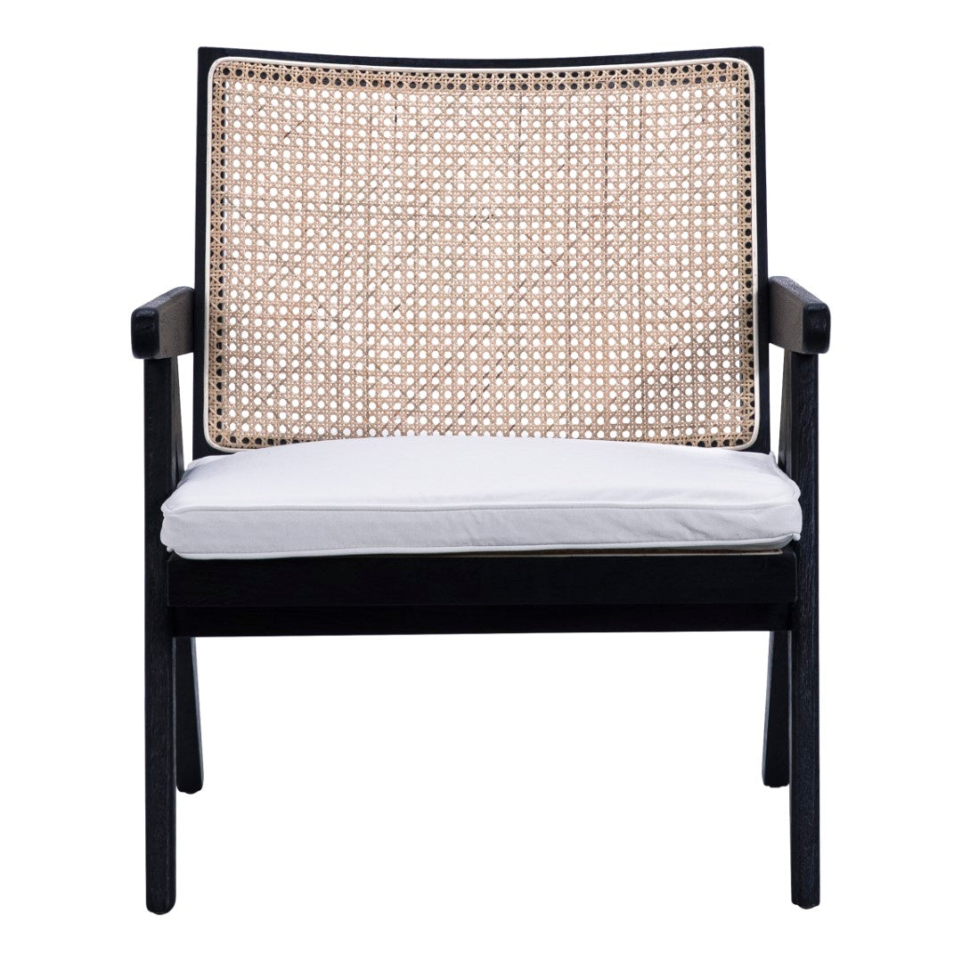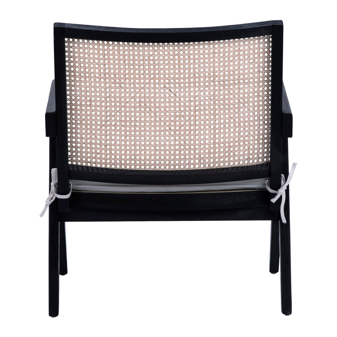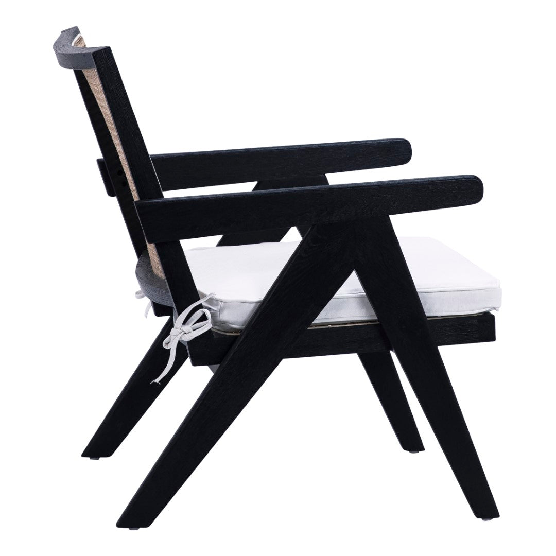 - Short Description: Modern Tri-Toned Dining Arm Chair Made From Black Stained Oak Hardwood, Natural Rattan Back, and White Cotton Tie-Back Cushion