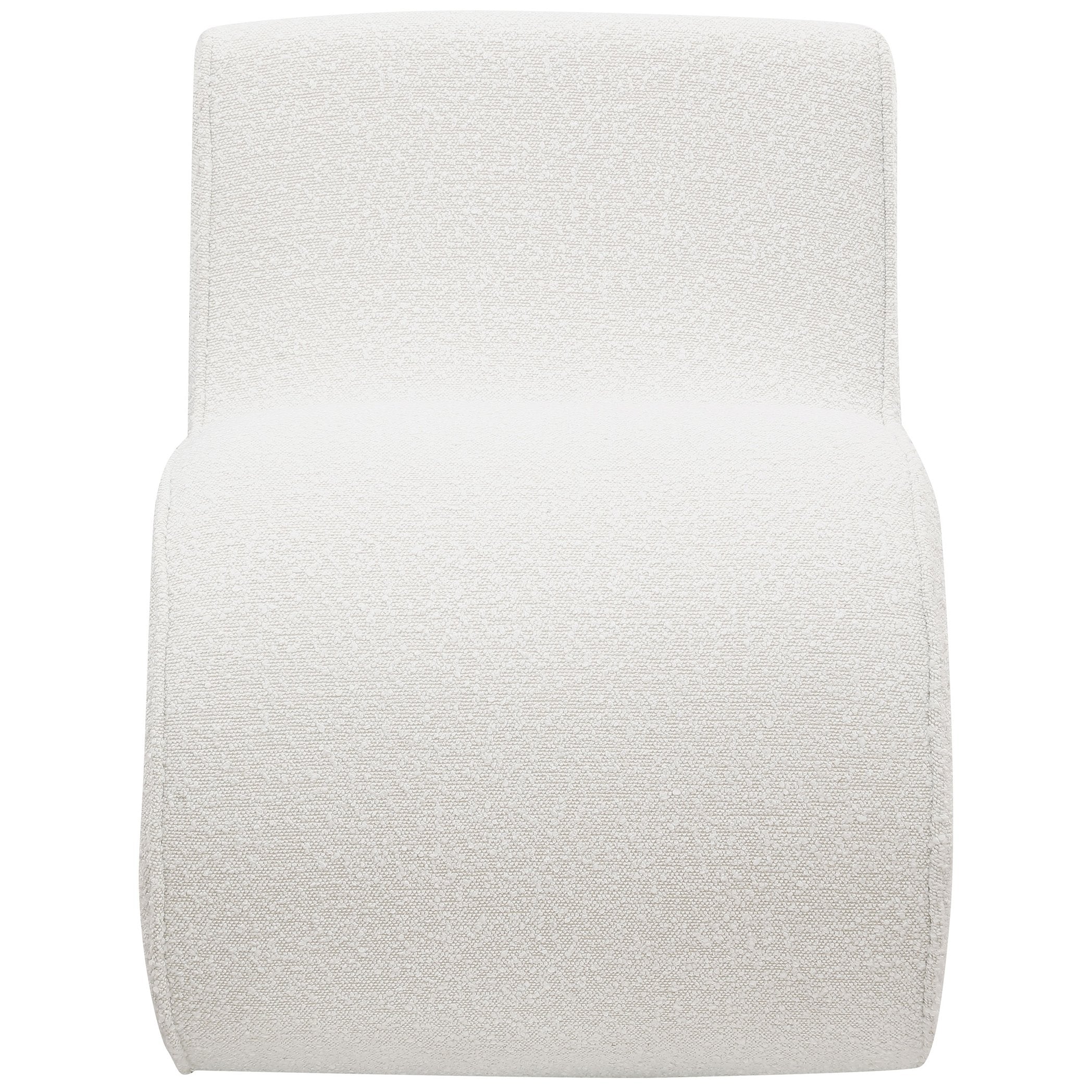 Elevate your space with a sculptural, contemporary accent chair that blends luxe comfort with modern design. Upholstered in soft cream bouclé, this armless curved chair offers a cozy seat and striking silhouette—ideal for living rooms, bedrooms, reading nooks, or boutique commercial settings where style and comfort matter.