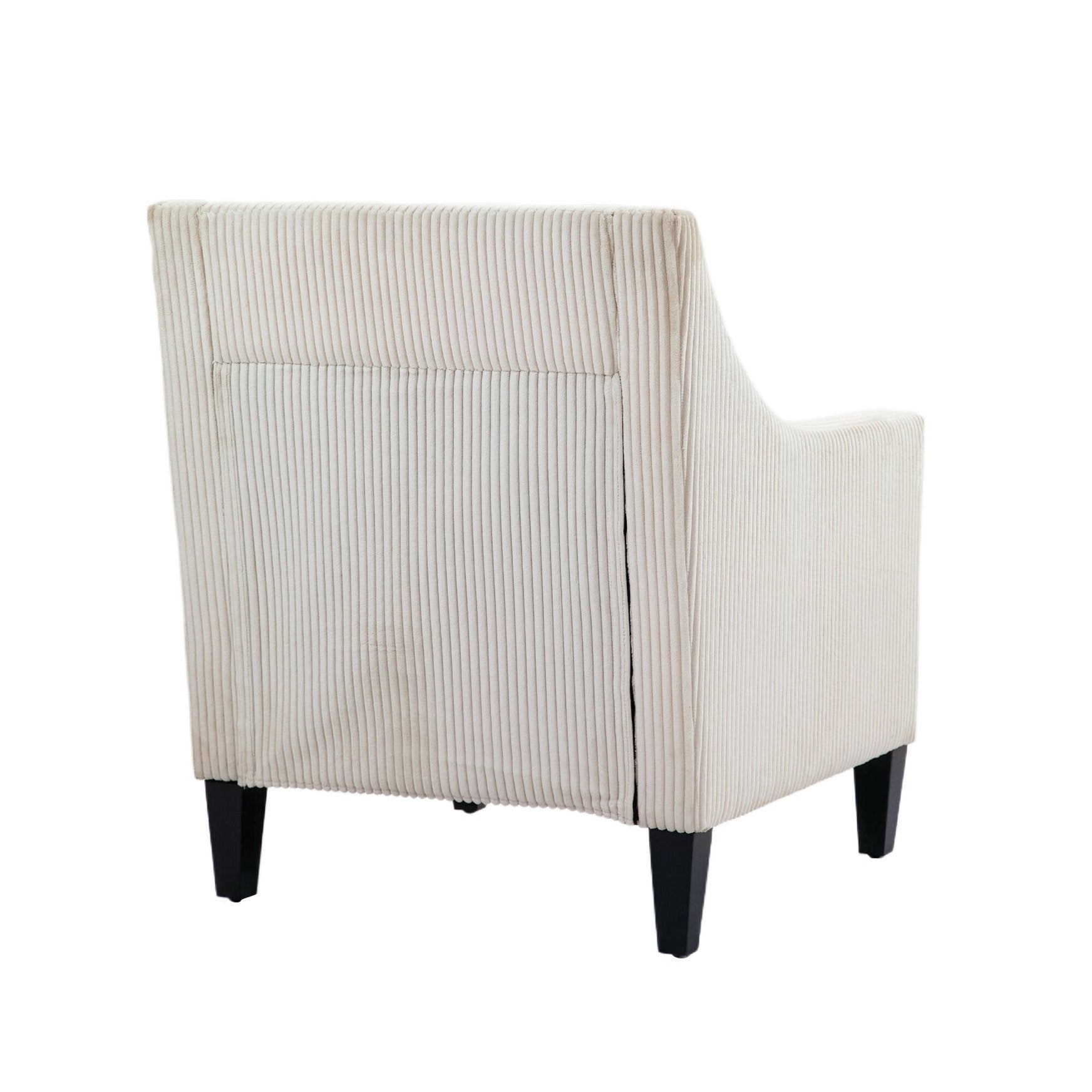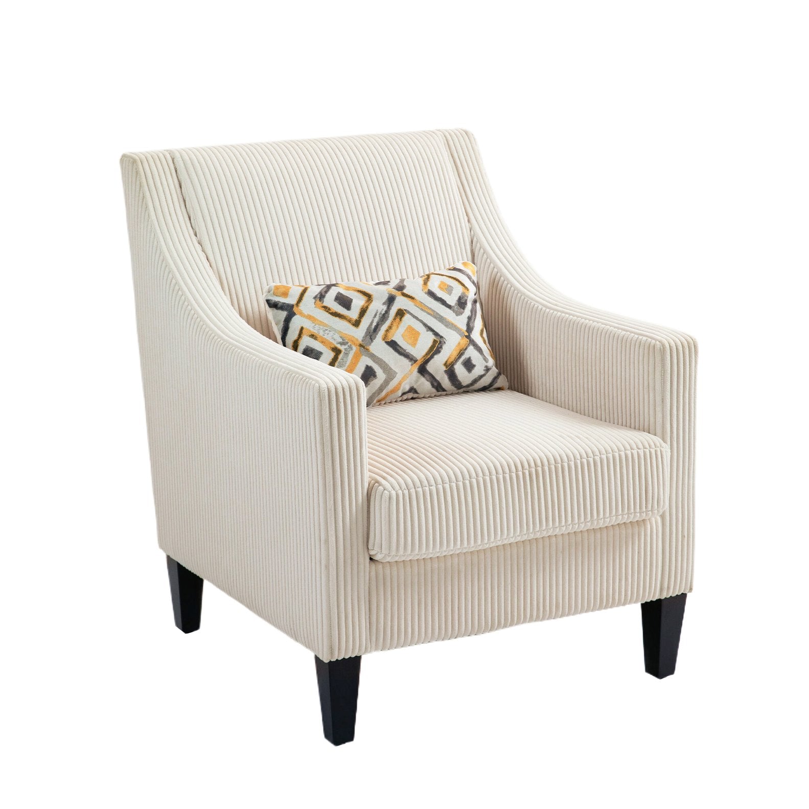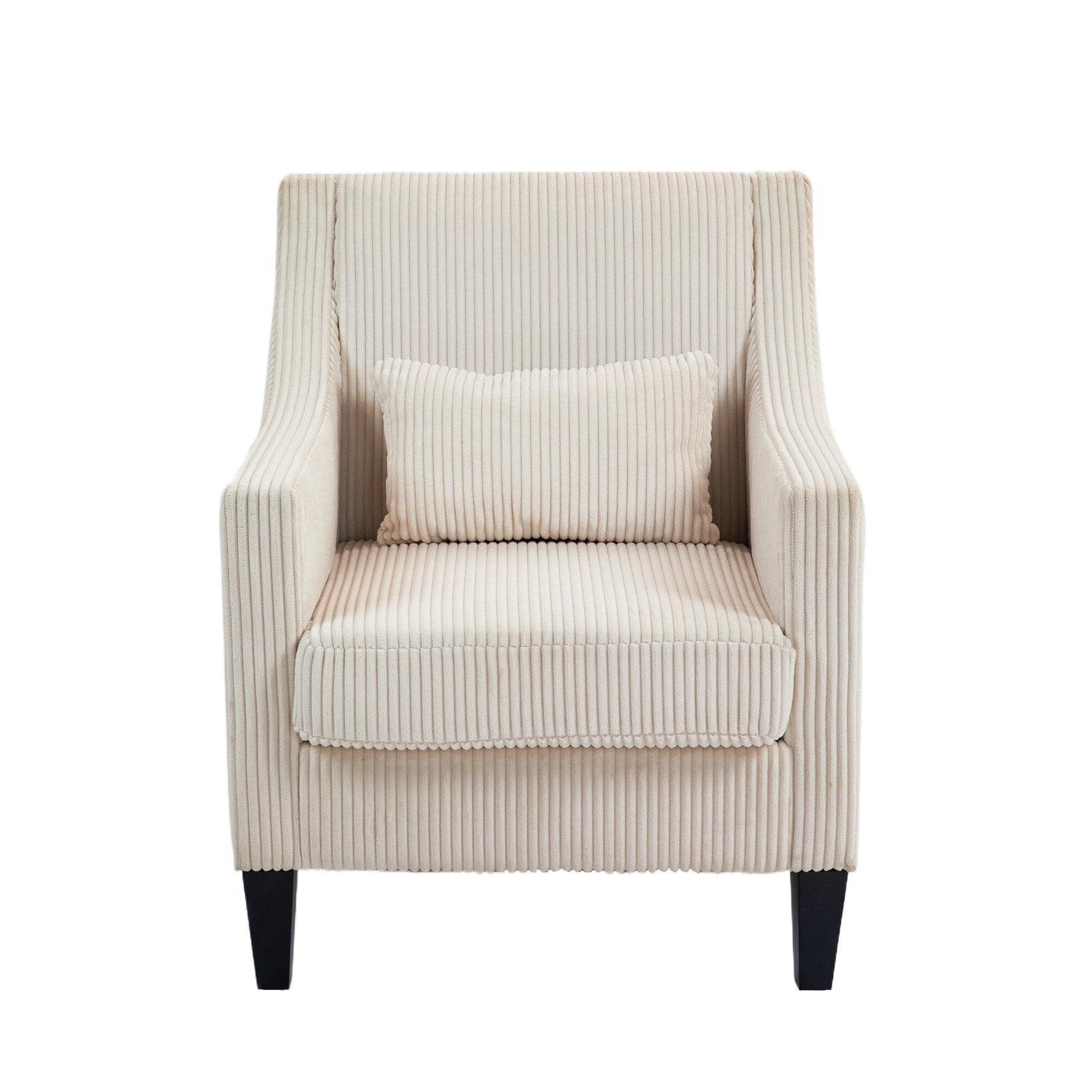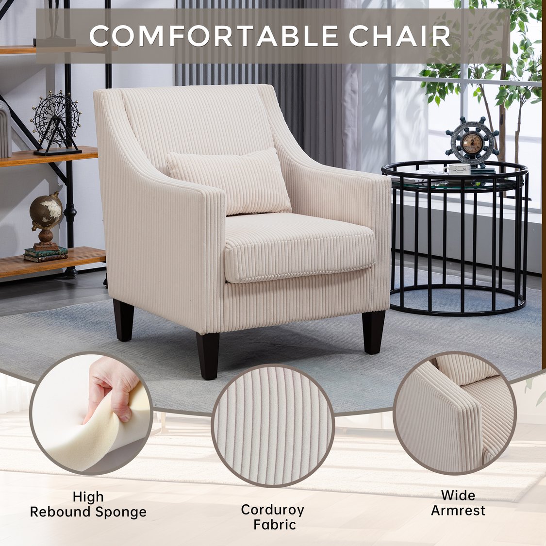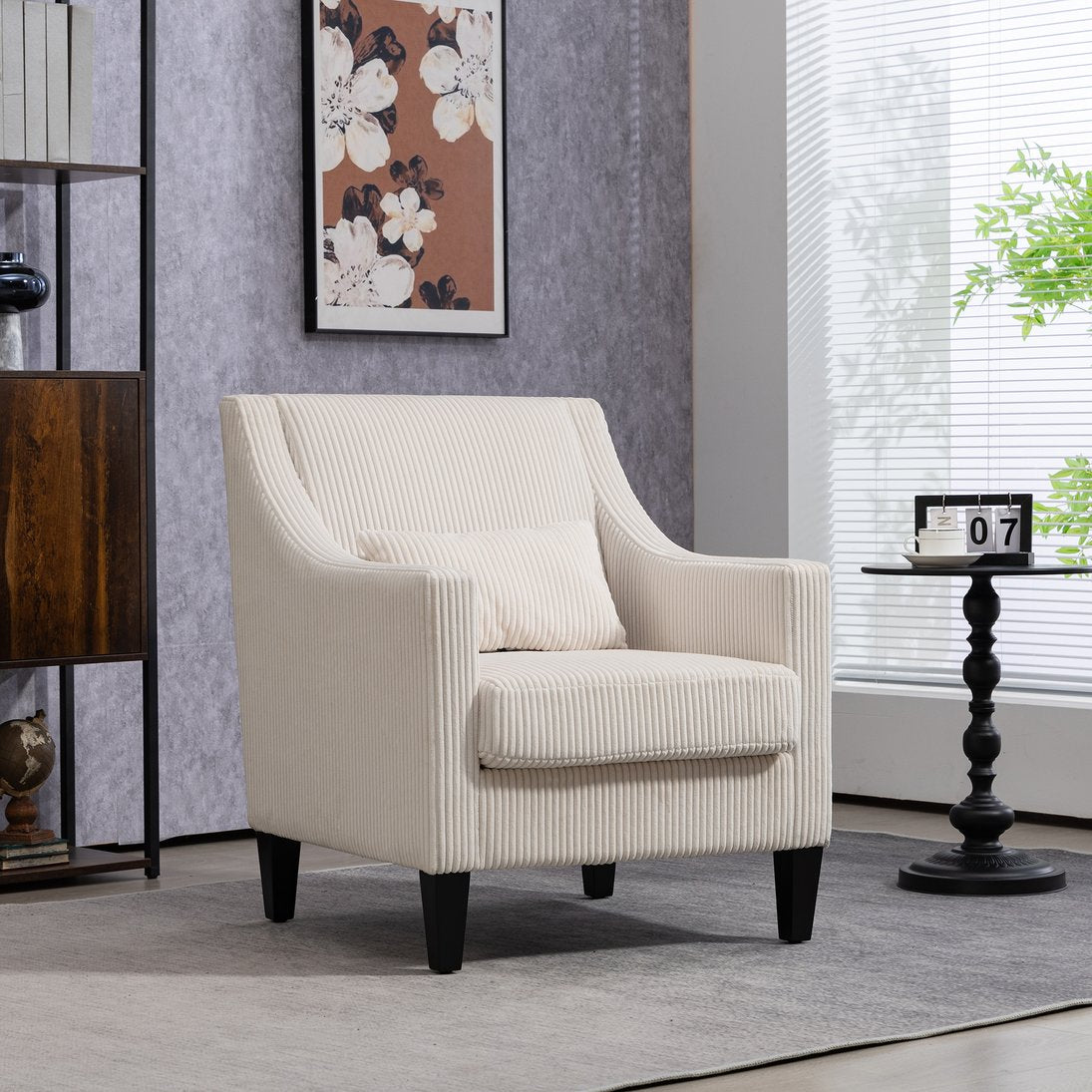 Bring modern comfort and stylish texture to any room with this cozy beige corduroy accent chair. Built on a sturdy solid-wood frame and padded with thick foam, the scooped arms and included lumbar pillow pair supportive ergonomics with a contemporary silhouette—perfect for apartments, bedrooms, offices, waiting rooms, or as a statement piece in living and dressing areas. Easy to assemble and sized for small spaces, this chair delivers durable everyday seating with refined, timeless appeal.