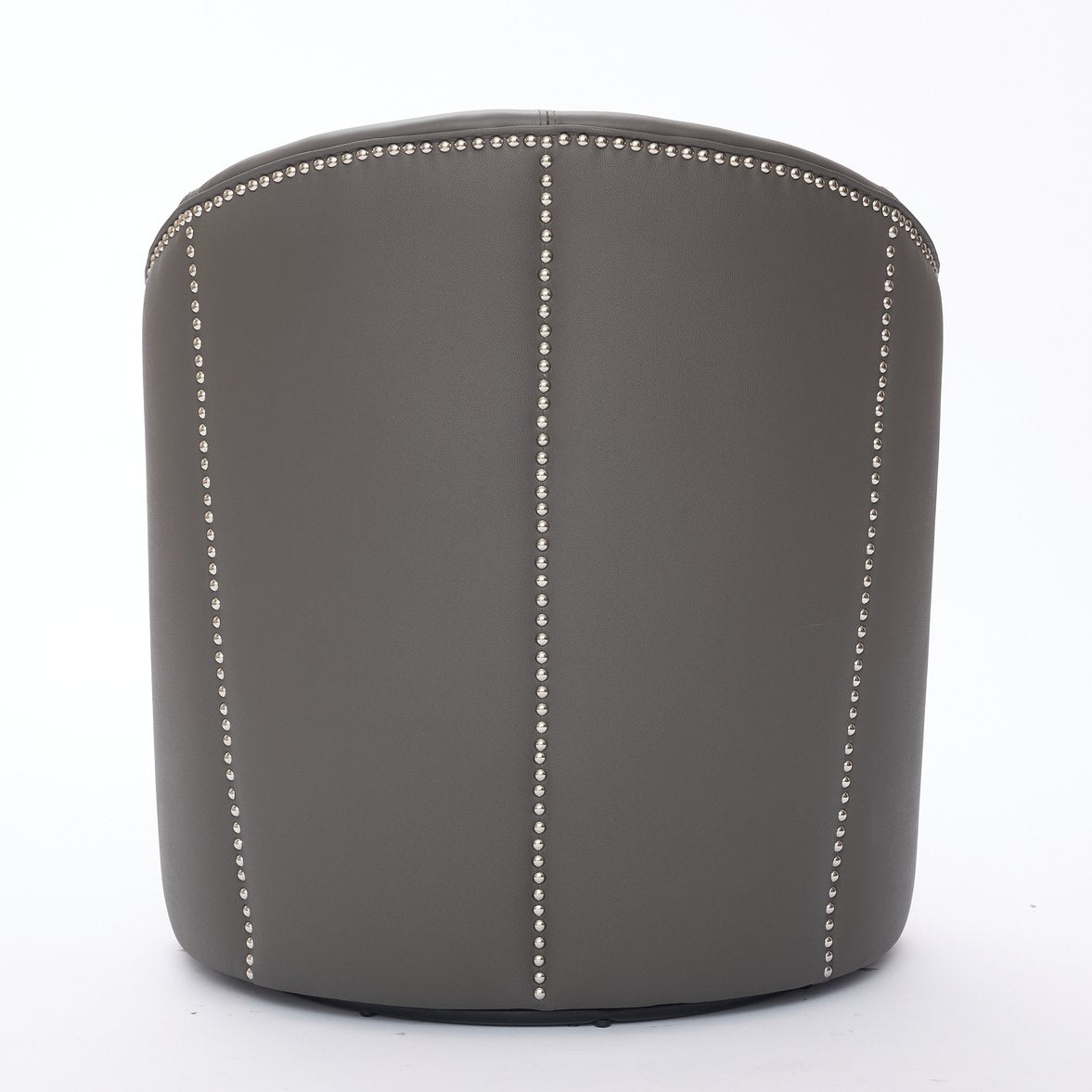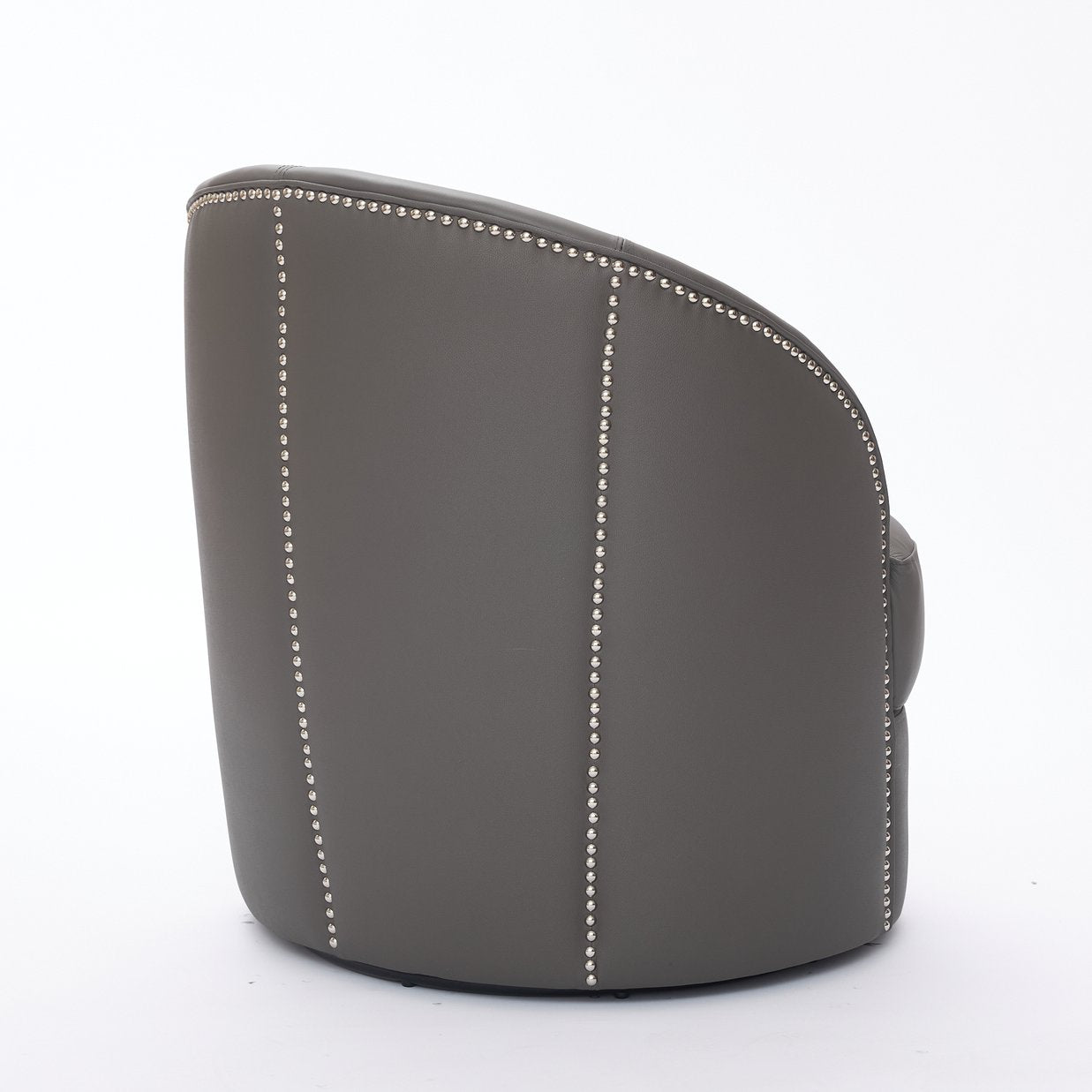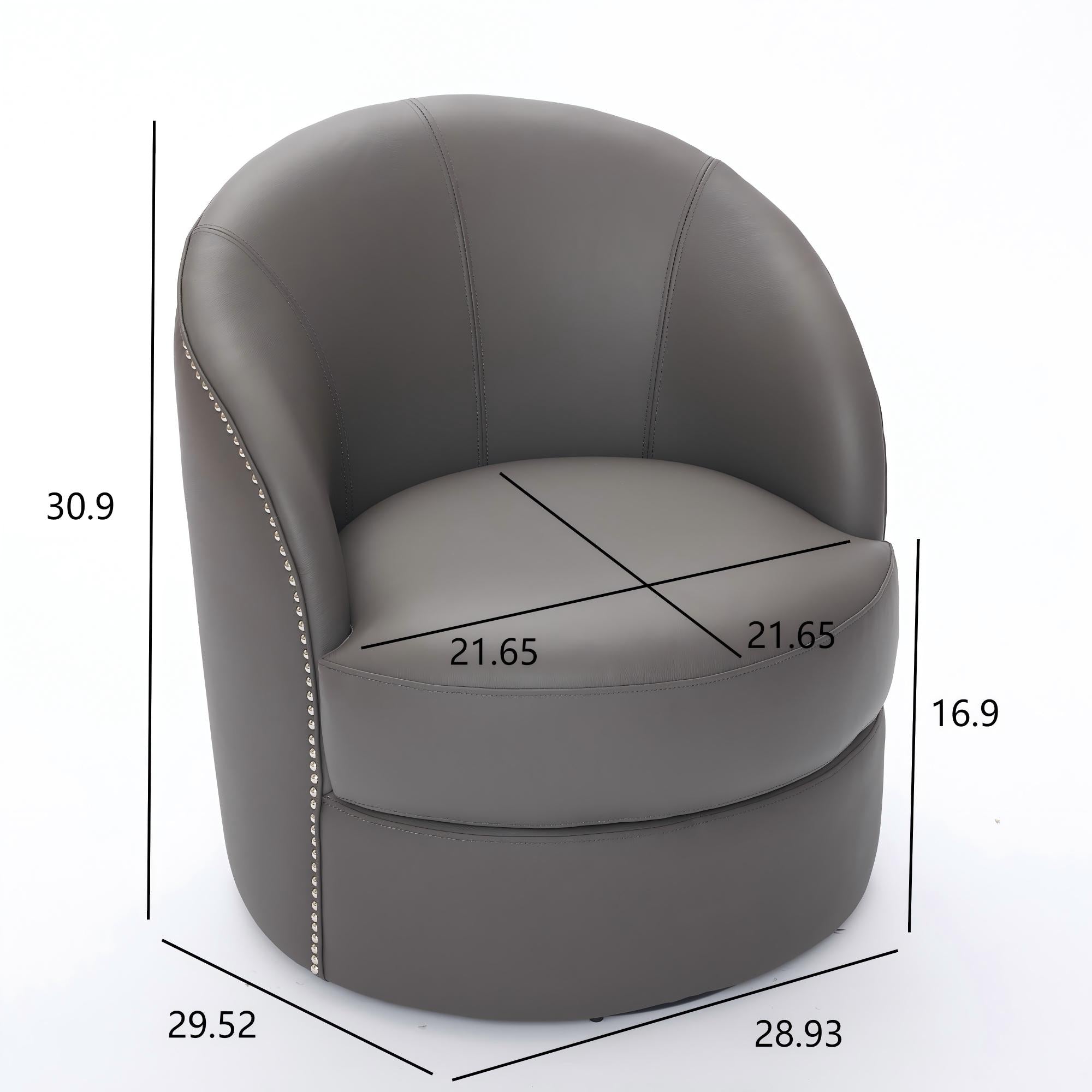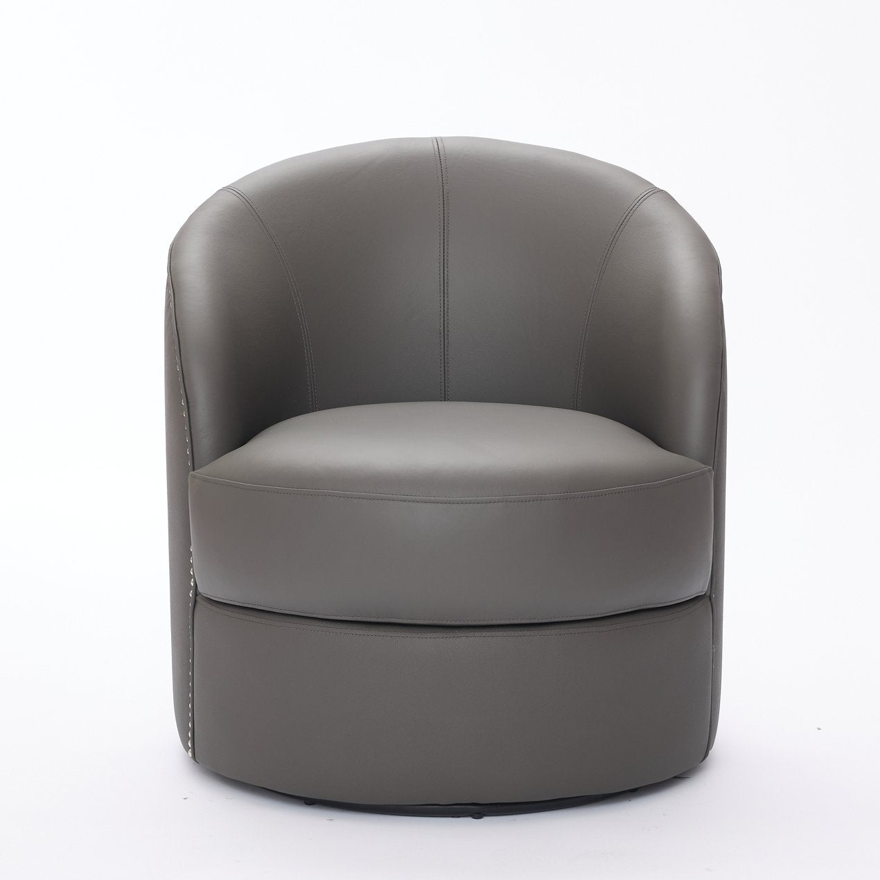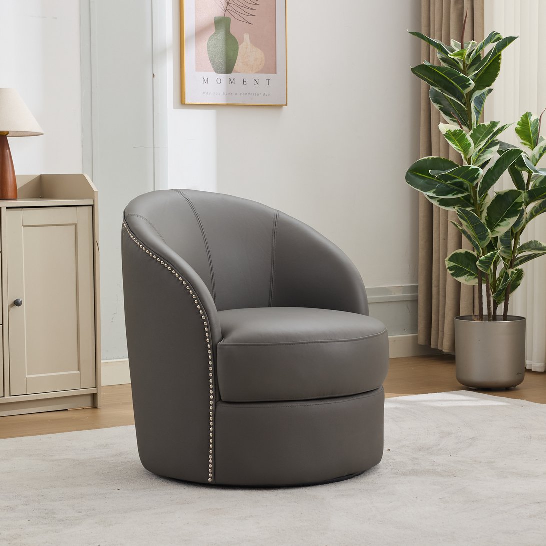 Bring modern flair and lasting comfort to your living room or office with this mid-century inspired swivel accent chair. Wrapped in breathable, easy-care top-grain leather and detailed with hand-set rivets, the chair combines refined style, durable construction, and a smooth 360° rotation for versatile everyday use — from casual lounging to focused work.