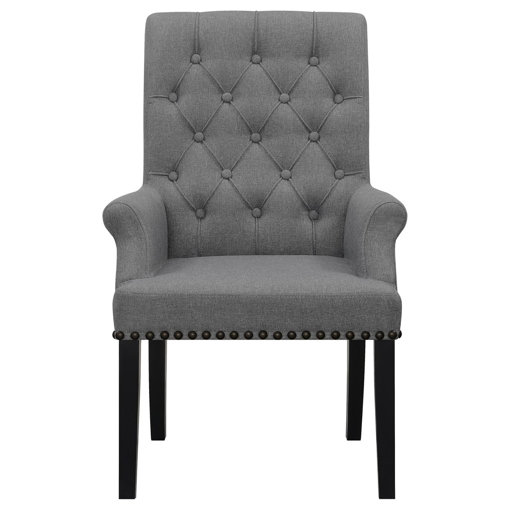 Elevate your dining or seating area with this elegant grey tufted arm chair, which blends classic tailoring with modern comfort. Thoughtful details—button tufting, rolled arms, and copper nailhead trim—pair with plush upholstery and sturdy wood legs to create a refined statement piece that suits formal dining rooms, home offices, or accent seating in living spaces.