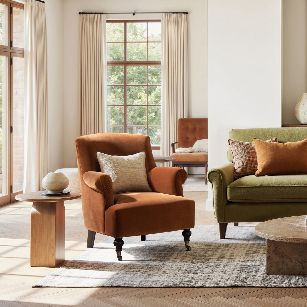 - Upholstery: Burnt orange performance velvet—soft to the touch, stain-resistant, and built for everyday use