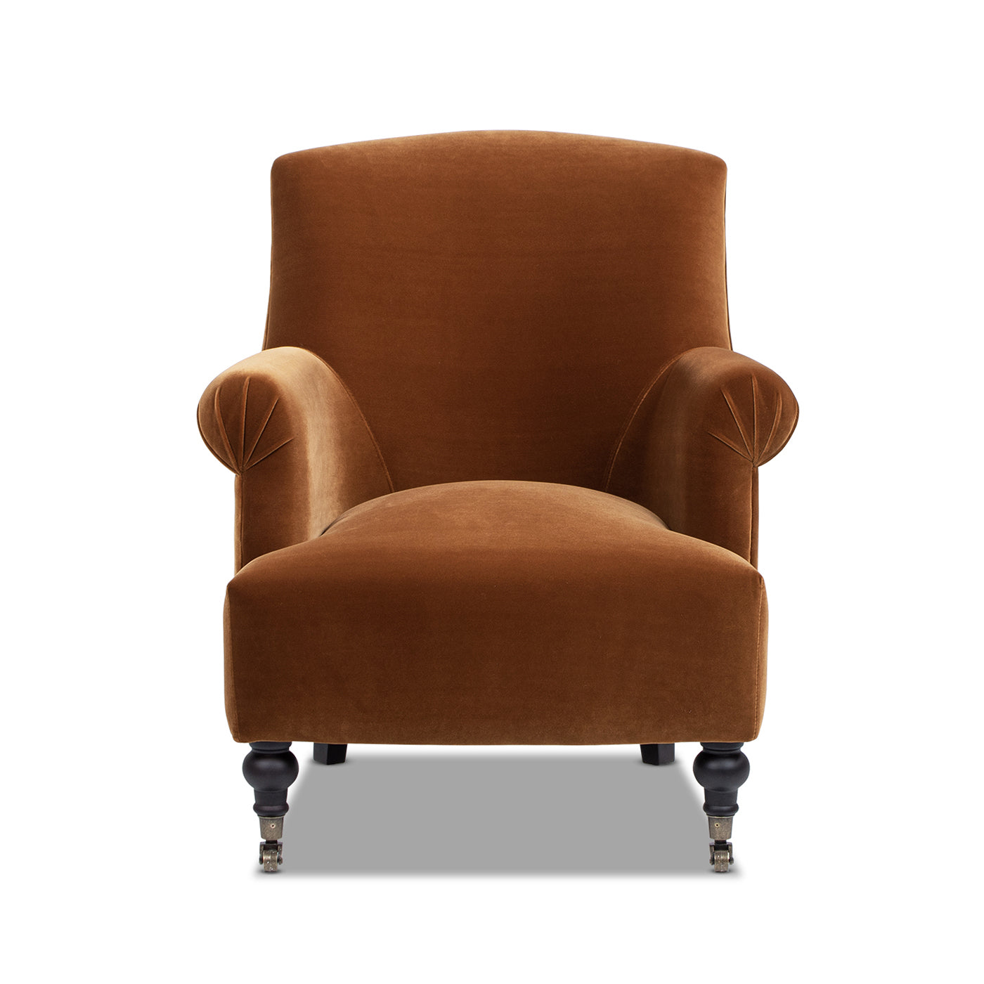 Add a warm, elegant touch to your living space with this compact accent chair in rich burnt orange performance velvet. Its classic pleated “sock” arm styling and camelback silhouette blend vintage charm with modern durability, making it an inviting focal point for small rooms, bedrooms, or apartment seating areas.