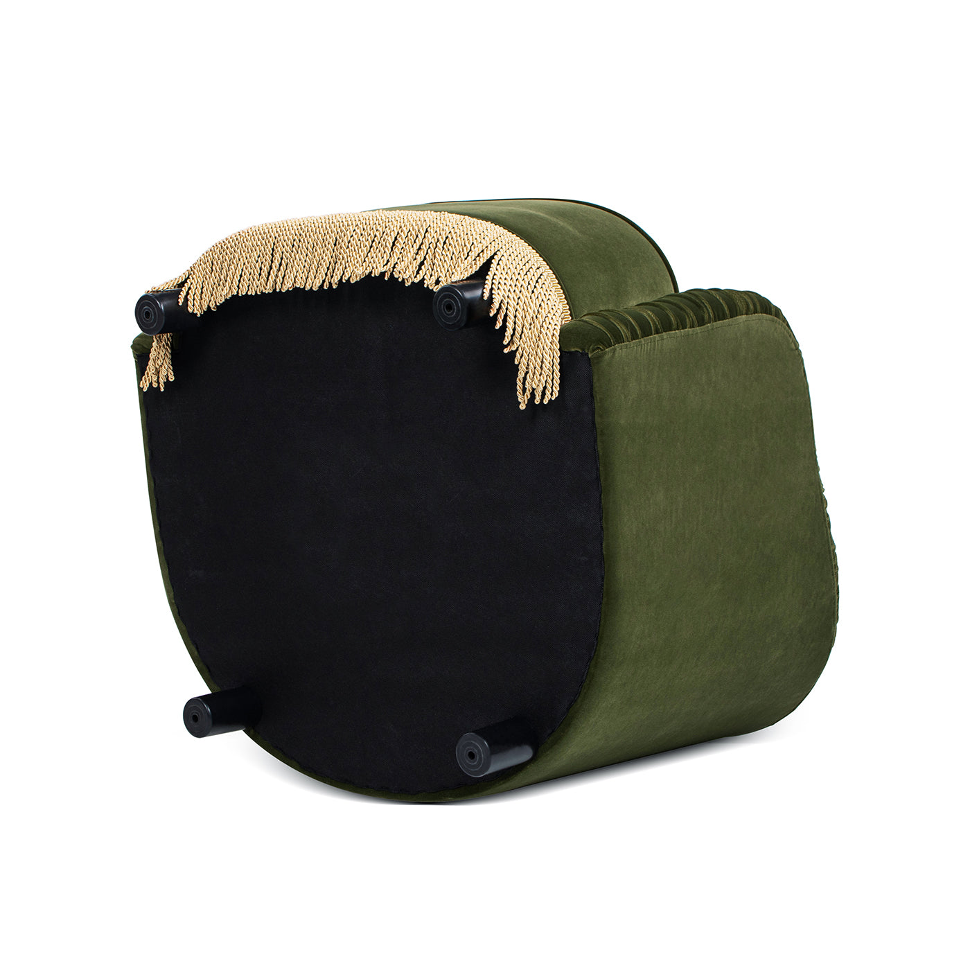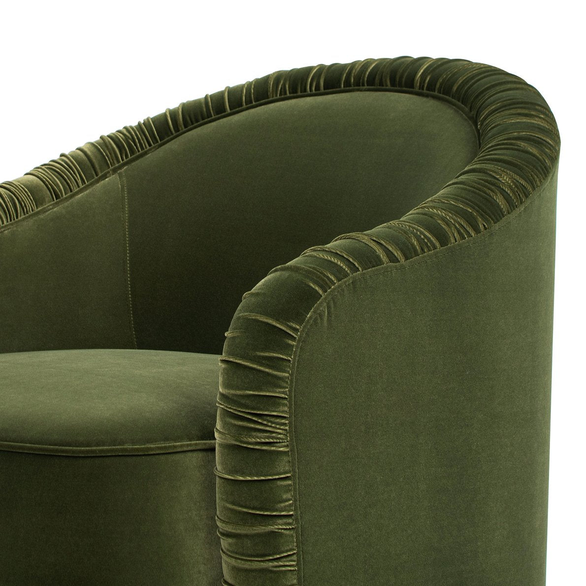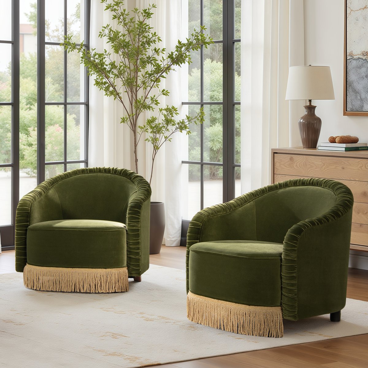 Elevate your seating area with a richly textured accent chair that blends vintage glamour and modern comfort. Wrapped in olive green performance velvet with ruched detailing and bullion fringe, this barrel-back arm chair offers both stylish presence and supportive, cozy seating—perfect as a standout focal point or paired for a coordinated look.
