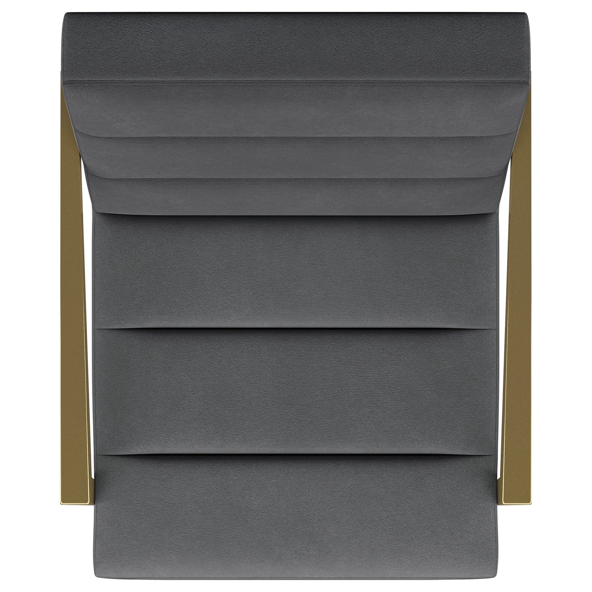 - The chair’s angular frame is crafted from durable metal and finished in a gleaming gold, adding a touch of sophistication and luxury to the overall design