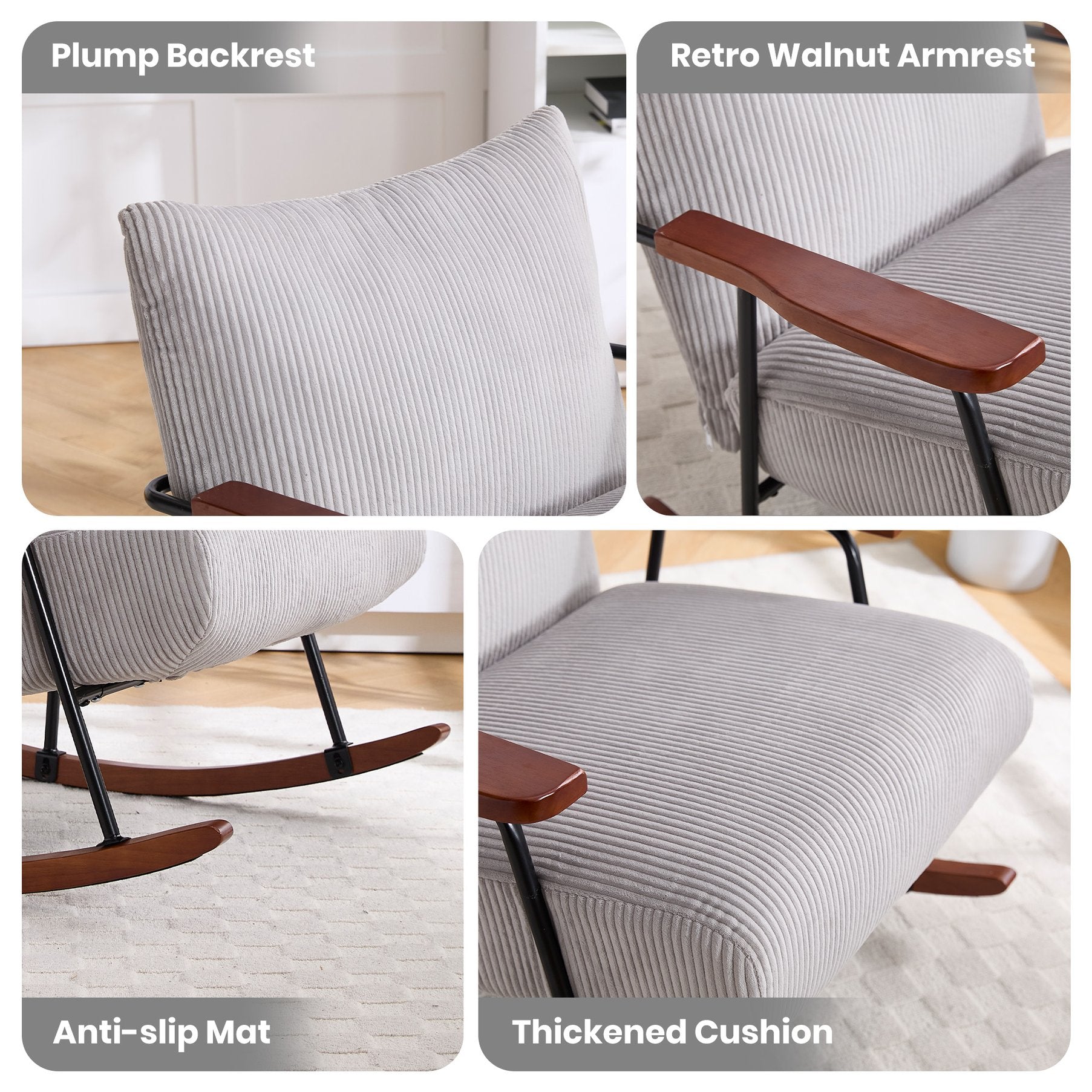 Bring mid-century charm and modern comfort to any room with this sleek rocking accent chair. Upholstered in soft grey fabric and supported by a sturdy metal frame with walnut-finished armrests, it’s designed for relaxed reading, casual conversations, or adding stylish flair to living rooms, bedrooms, offices, and reception areas. The contoured seat and gentle rocking motion provide long-lasting comfort while the durable construction supports everyday use.