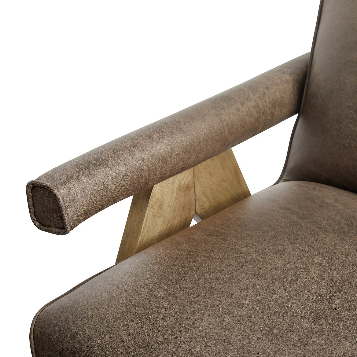 - Elevate your space with the sophisticated charm of the Nessi Modern Arm Chair. Wrapped in rich, durable faux leather upholstery in your choice of Sand or Espresso, this accent chair blends mid-century style with contemporary comfort. Crafted with solid wood legs in a distinctive A-frame design and finished in a light Walnut stain, this chair is both sturdy and stylish. Corded seams add a tailored touch, and integrated floor glides protect your surfaces from scratches and scuffs.