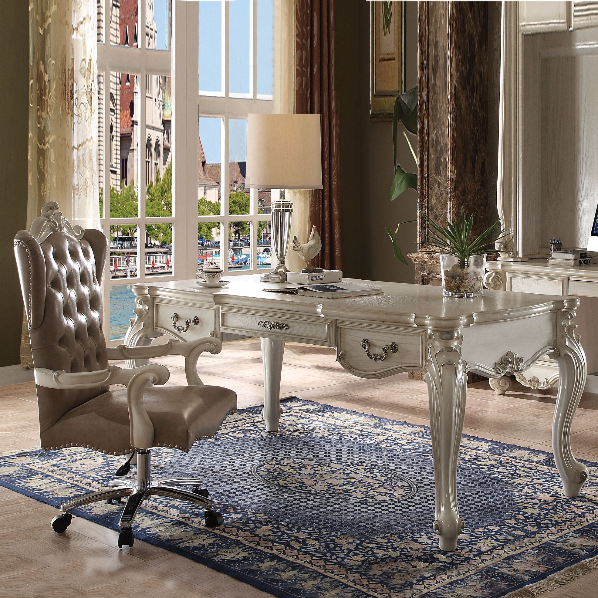 This vintage-inspired swivel chair blends executive comfort with classic styling to elevate any office or living space. Plush cushioning, a high tufted back, and a smooth swivel-and-lift mechanism provide ergonomic support and adjustable convenience, while hand-brushed moldings, nailhead trim, and vintage grey and bone white upholstery deliver a refined, timeless appearance.