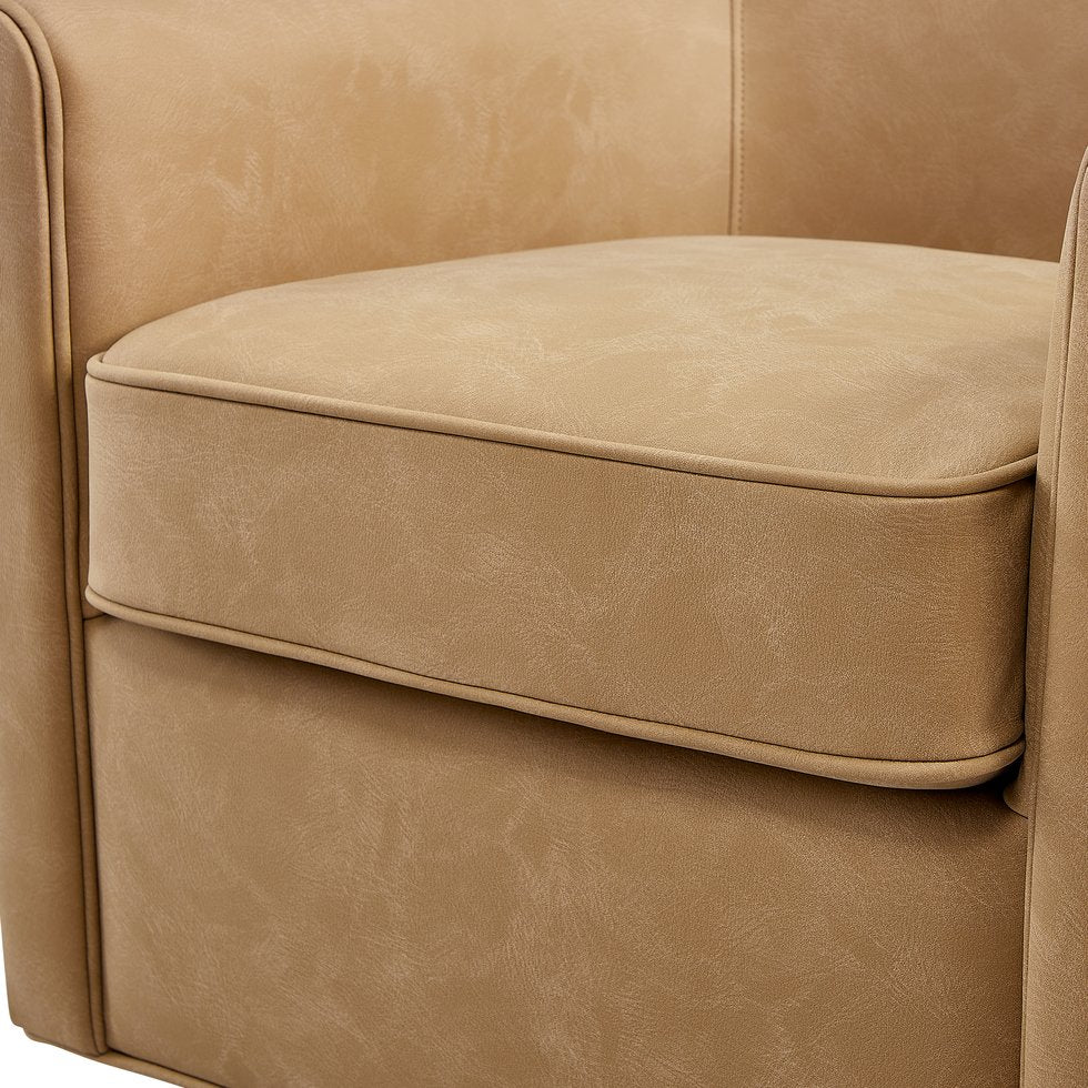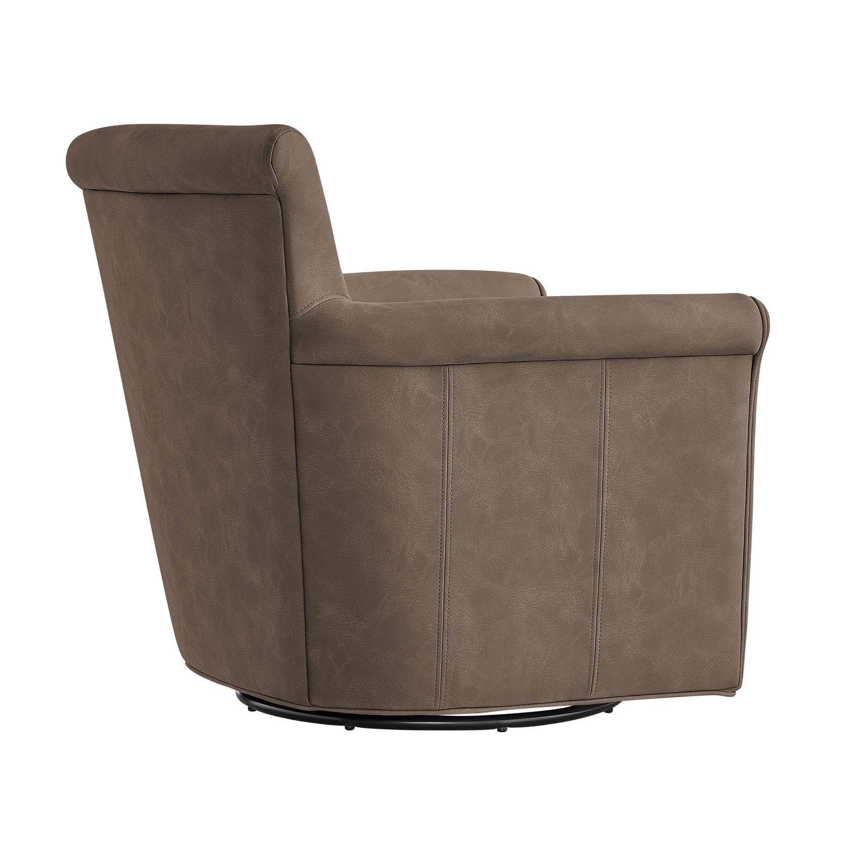 Add refined comfort and versatile style to any room with the Westly Faux Leather Swivel Accent Chair. Wrapped in durable taupe faux leather and finished with decorative topstitching and welted seams, this chair blends transitional design with everyday functionality—ideal for living rooms, bedrooms, home offices, or reading nooks. The rolled back and arms offer an inviting silhouette, while a full 360-degree metal swivel base and integrated floor glides make placement and use effortless.