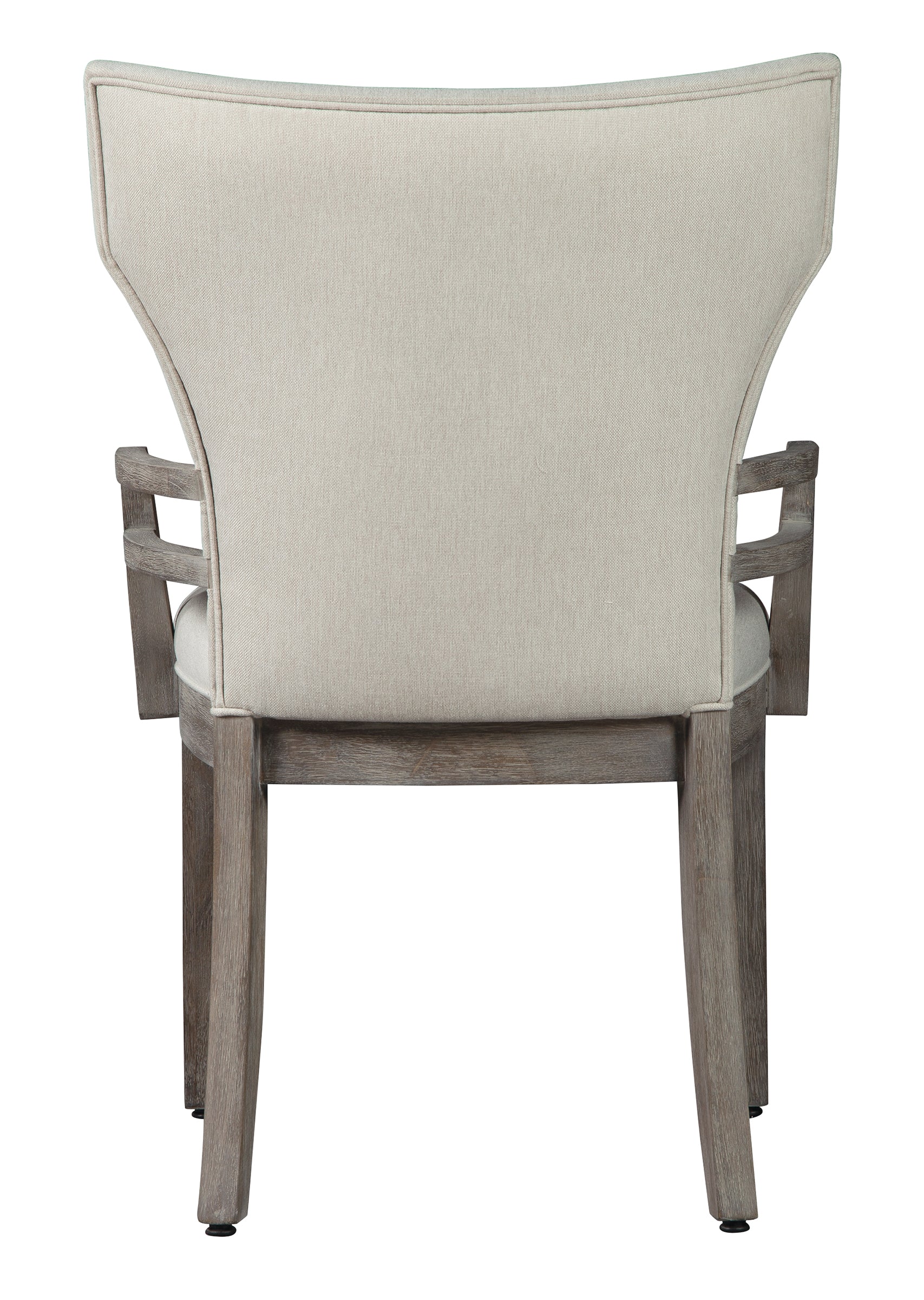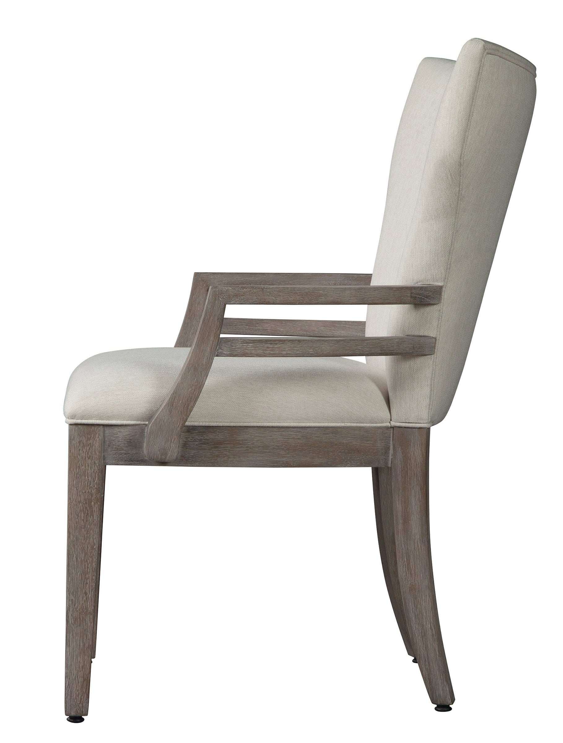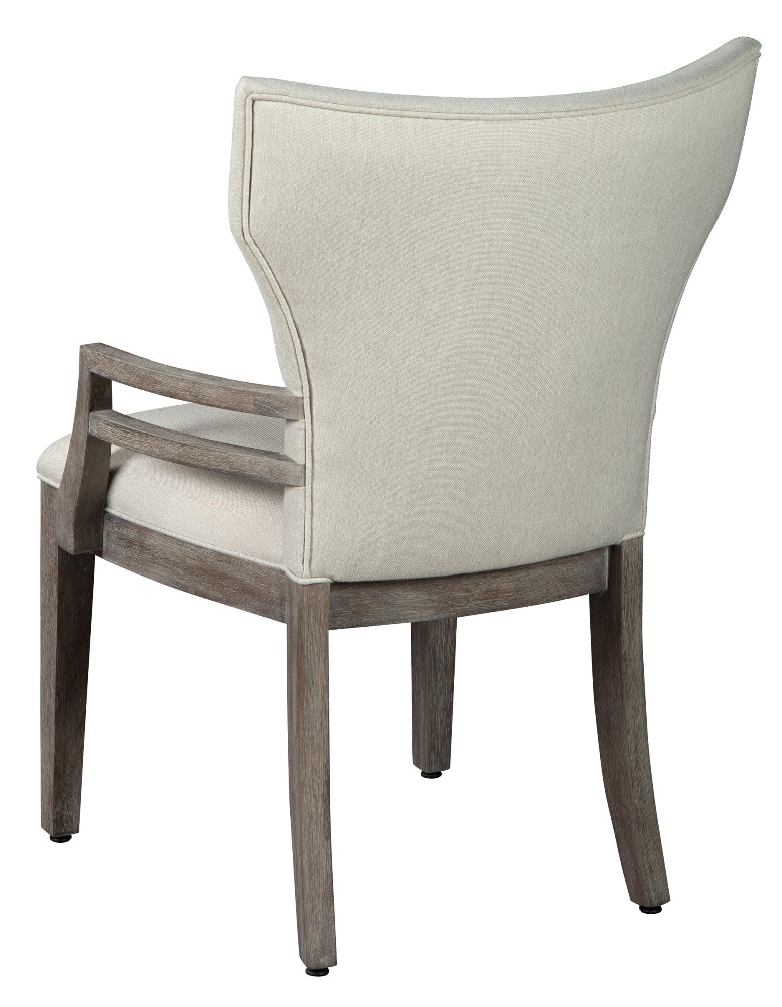 - A gracefully shaped upholstered back with arm detailed with a single stretcher underneath for a contemporary touch.