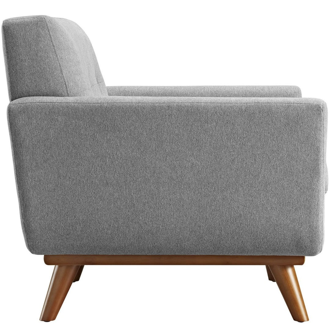 Sink into the Engage Upholstered Armchair — a stylishly modern piece designed for everyday comfort and visual appeal. With softly sloping curves, a plush seat cushion, and three tufted buttons, this armchair adds cozy sophistication to living rooms, reading nooks, or conversation areas. Solid cherry-colored rubberwood legs provide durable support while the tailored upholstery and thoughtful proportions make it a versatile focal point for a variety of interiors.