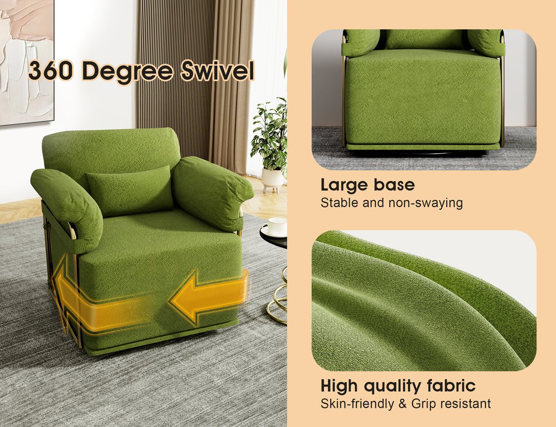 Bring modern comfort and eye-catching style to your living room, bedroom, or office with this plush swivel accent chair. Upholstered in soft, skin-friendly fabric and supported by a chic gold metal base, the chair combines luxurious appearance with everyday functionality — ideal for reading, relaxing, or entertaining.