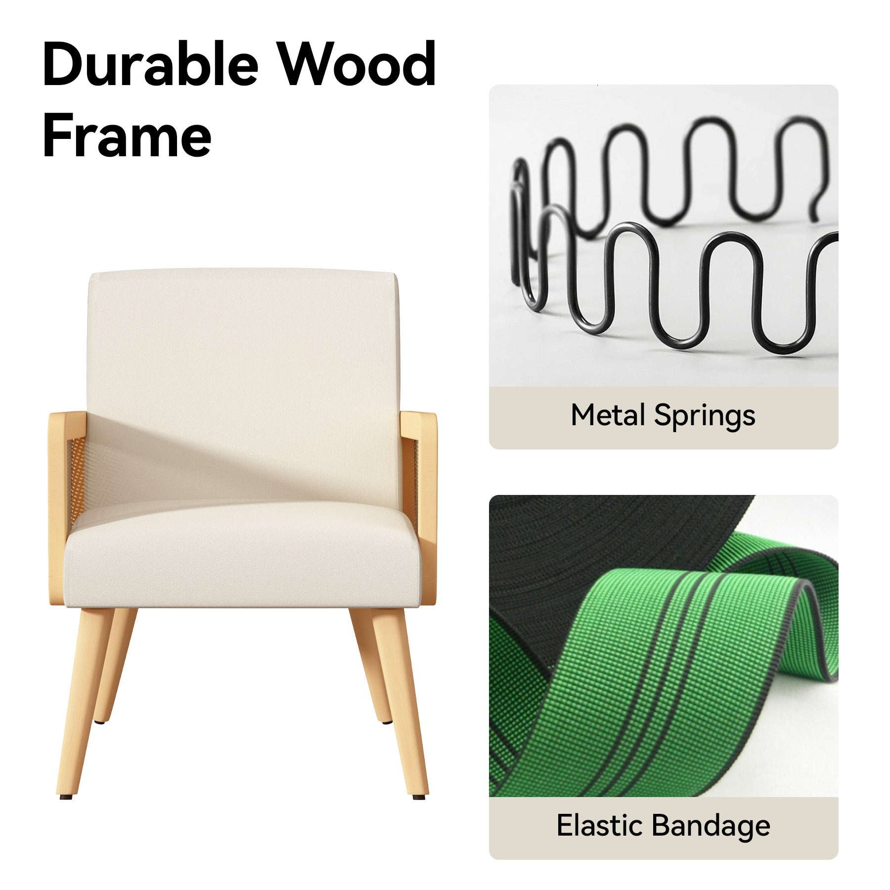 - 【Stylish Armrests】:This modern accent chair with natural cane paneled Arm beautiful and unique for our home or office. Vintage style rattan has good breathability, strong elasticity and fine tenacity. The natural wood style combined with the soft fabric creates a warm and neutral color palette.
