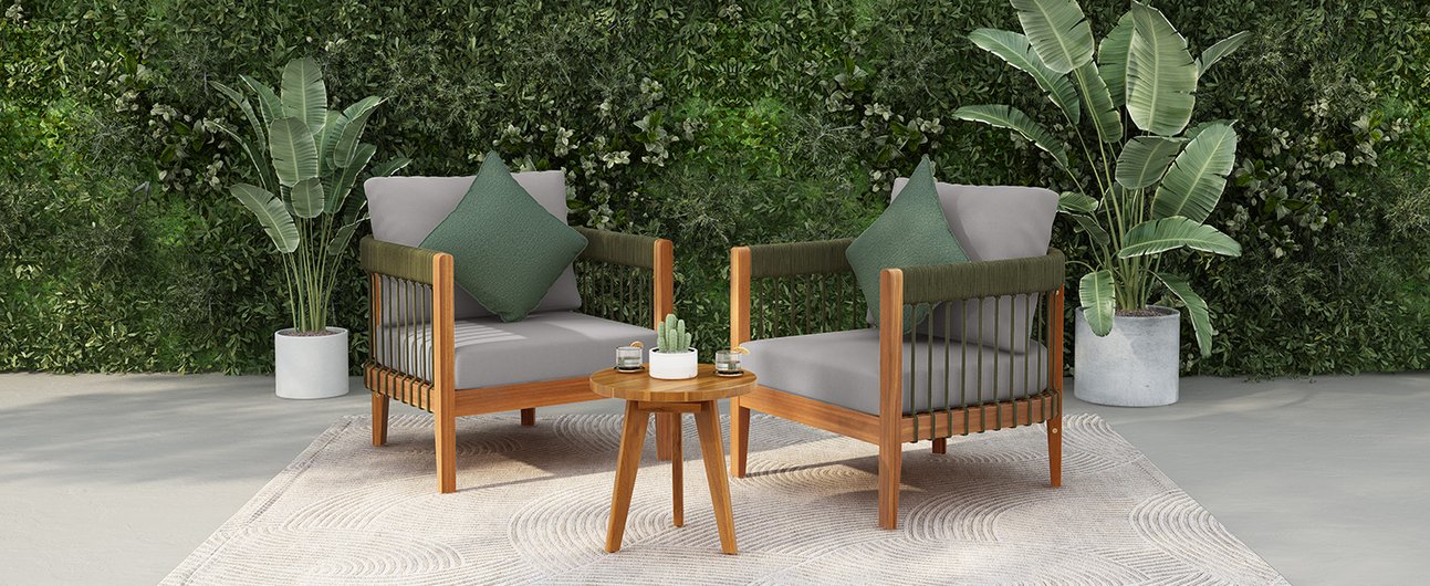 Bring effortless boho charm to your porch or garden with this three-piece outdoor club chair set, blending warm acacia wood, handwoven rope accents, and plush water-resistant cushions for comfortable, stylish lounging year-round.