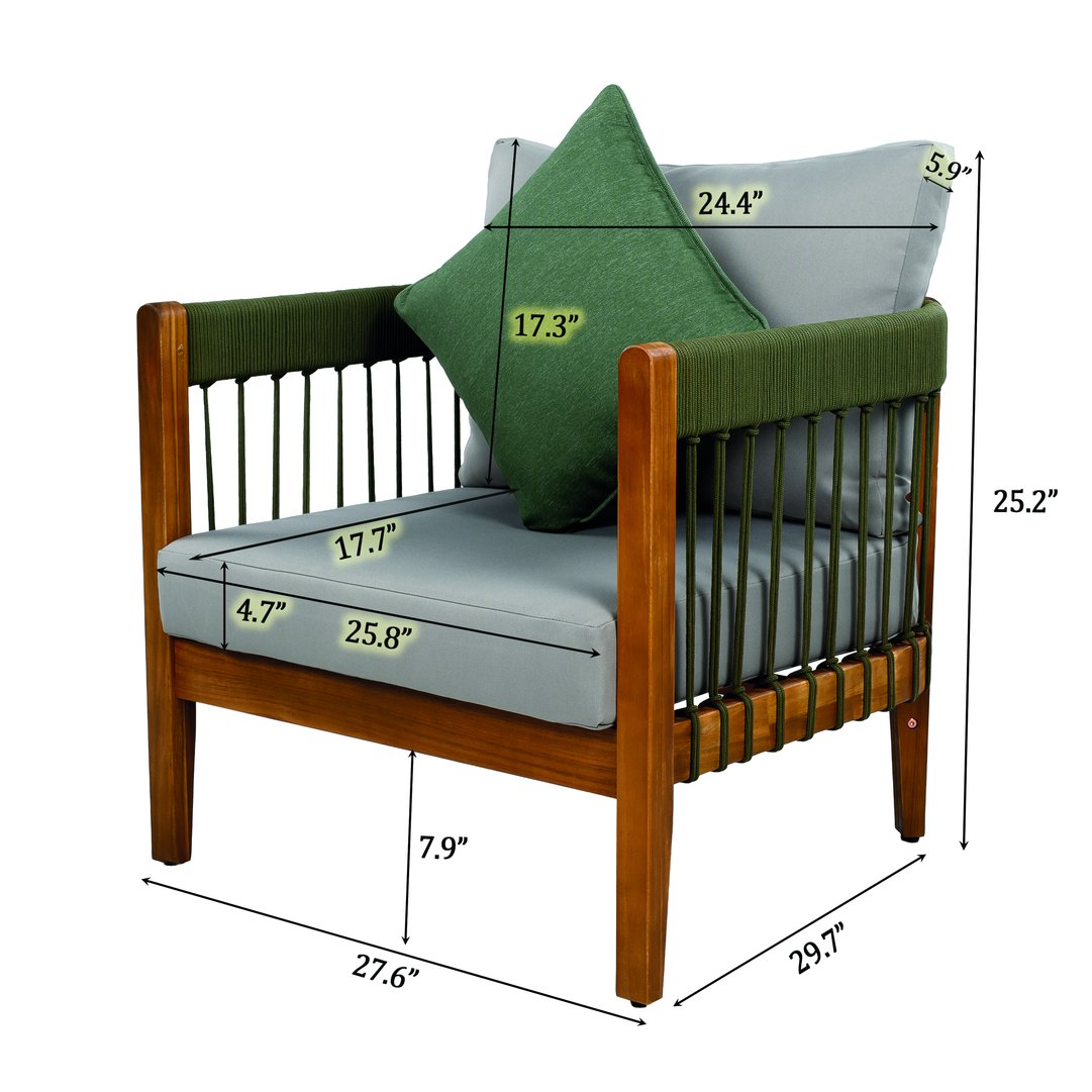 - Set Includes: Three matching acacia wood club chairs with removable cushions (color: Green, Natural + Beige).