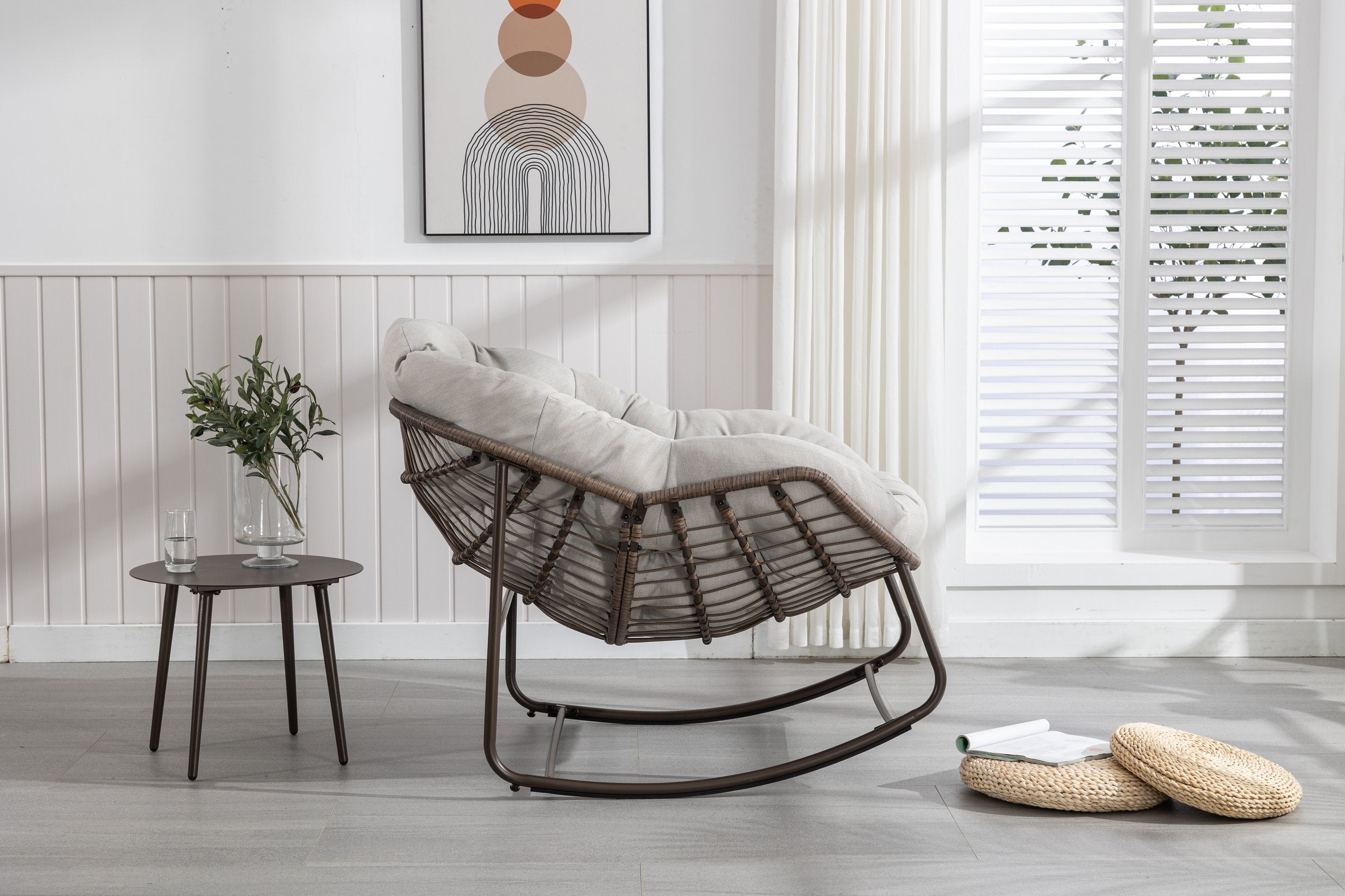 Sink into a cozy retreat with this hand-woven outdoor rattan rocking chair. Designed for both style and comfort, the generous, ergonomic shell and plush padded cushion create a soothing lounge experience on your porch, patio, garden, or in a relaxed indoor space. Durable synthetic rattan and a sturdy steel frame provide weather-resistant performance and stable rocking motion, while the neutral beige tone complements a wide range of décor.