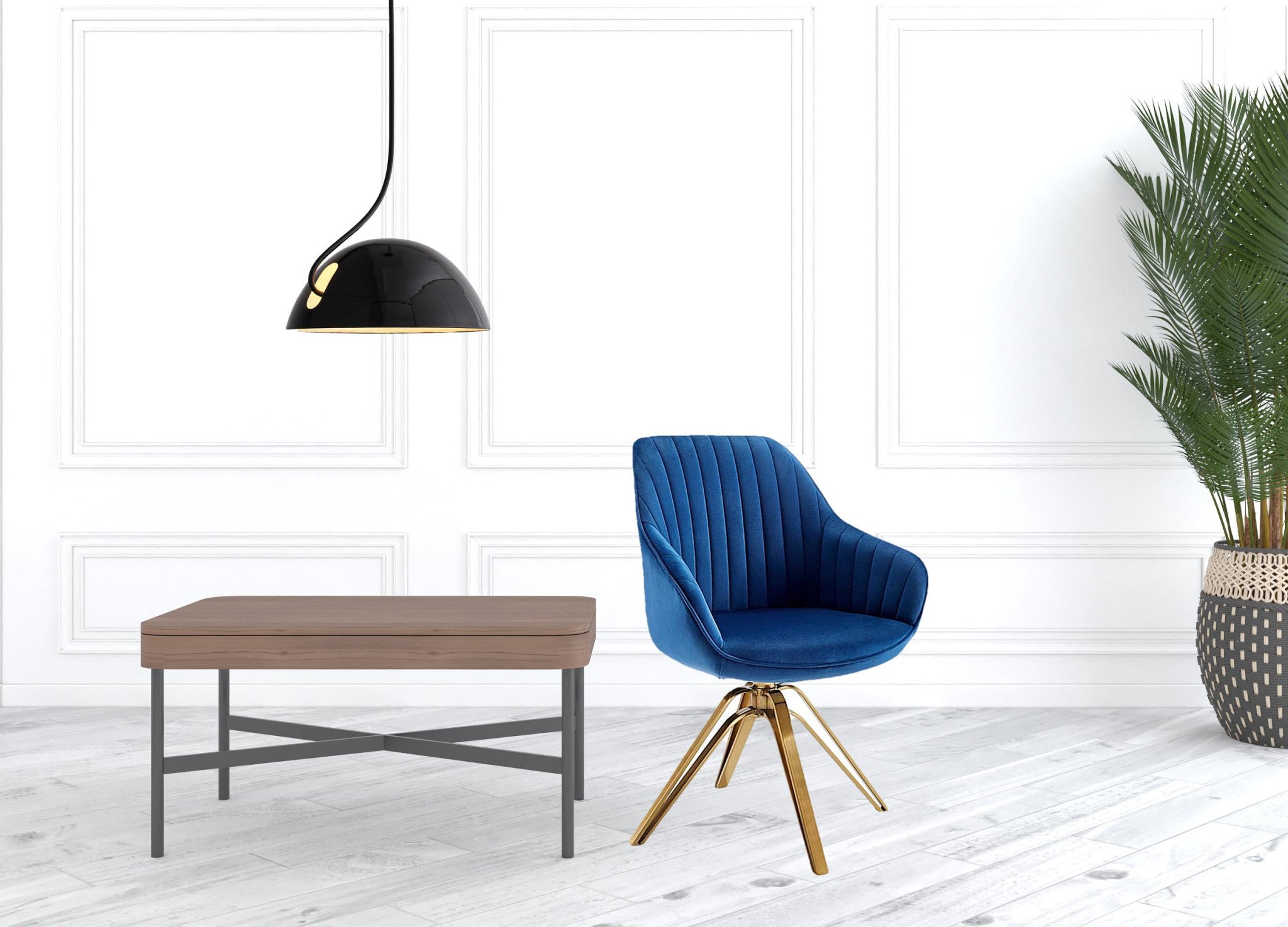 - Stylish armchair with flared arms and a solid blue velvet upholstery.