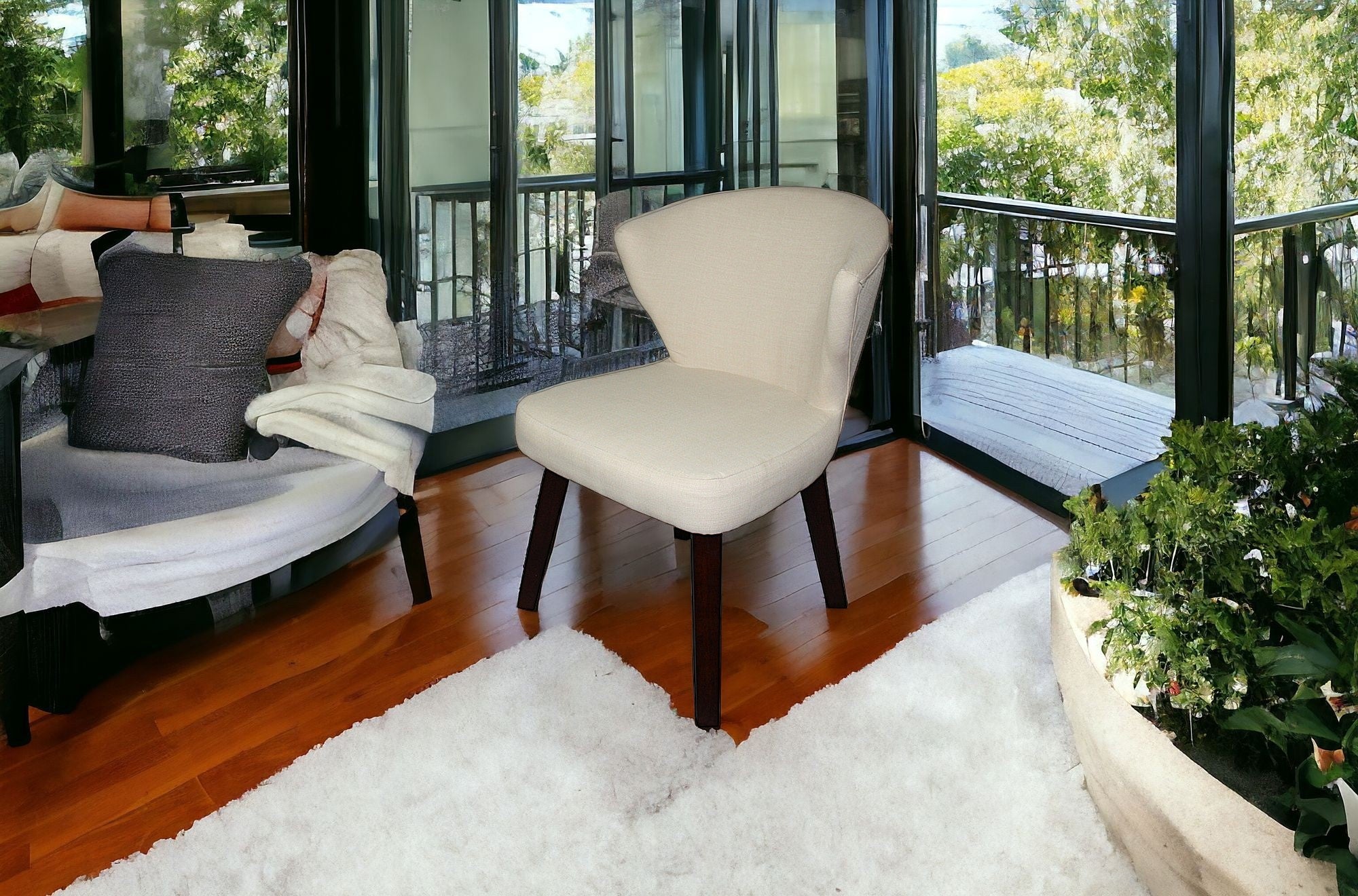 - Upholstered in a cream-colored fabric for a stylish touch.