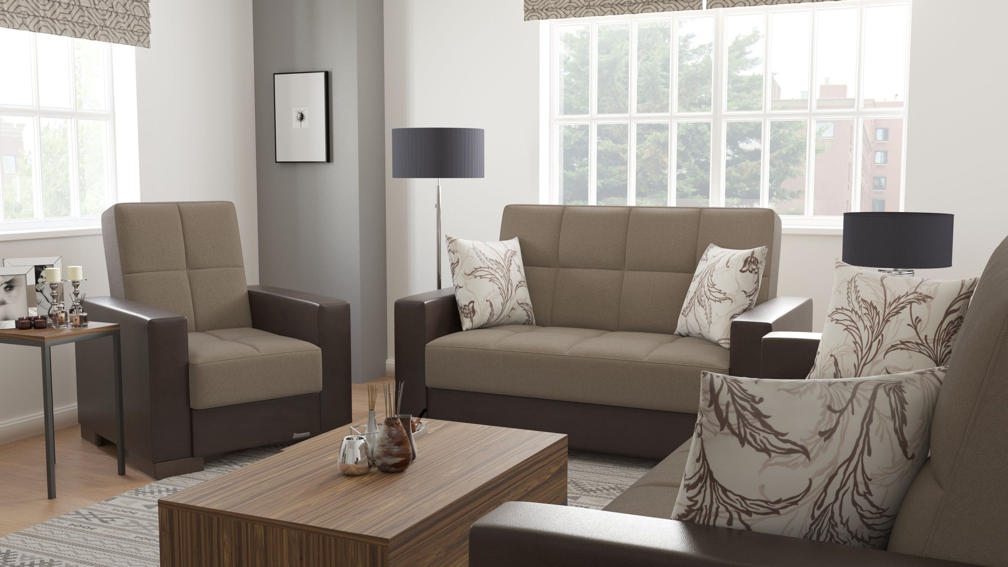 - Features square arms and tufted cushions for added style and comfort.