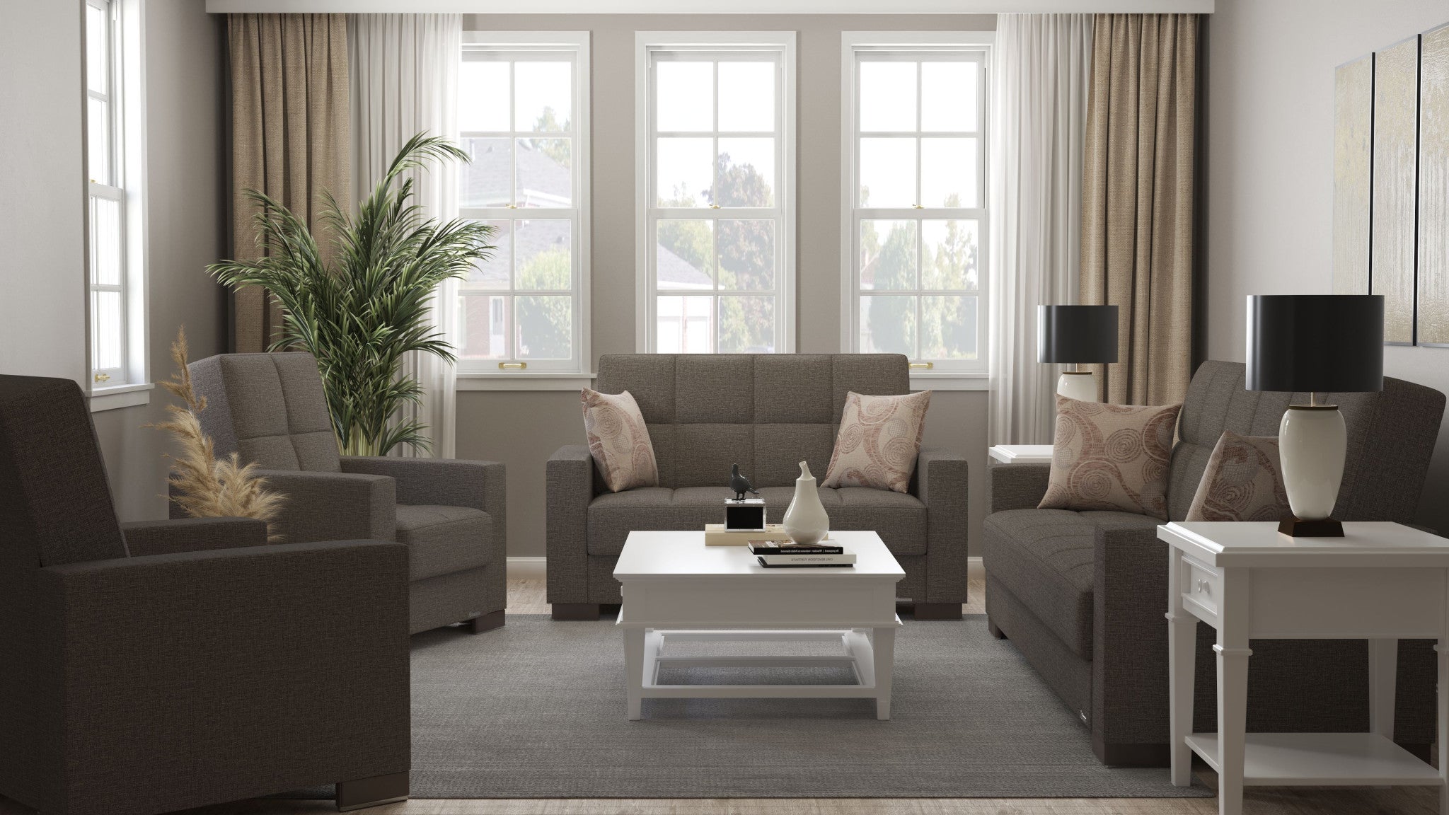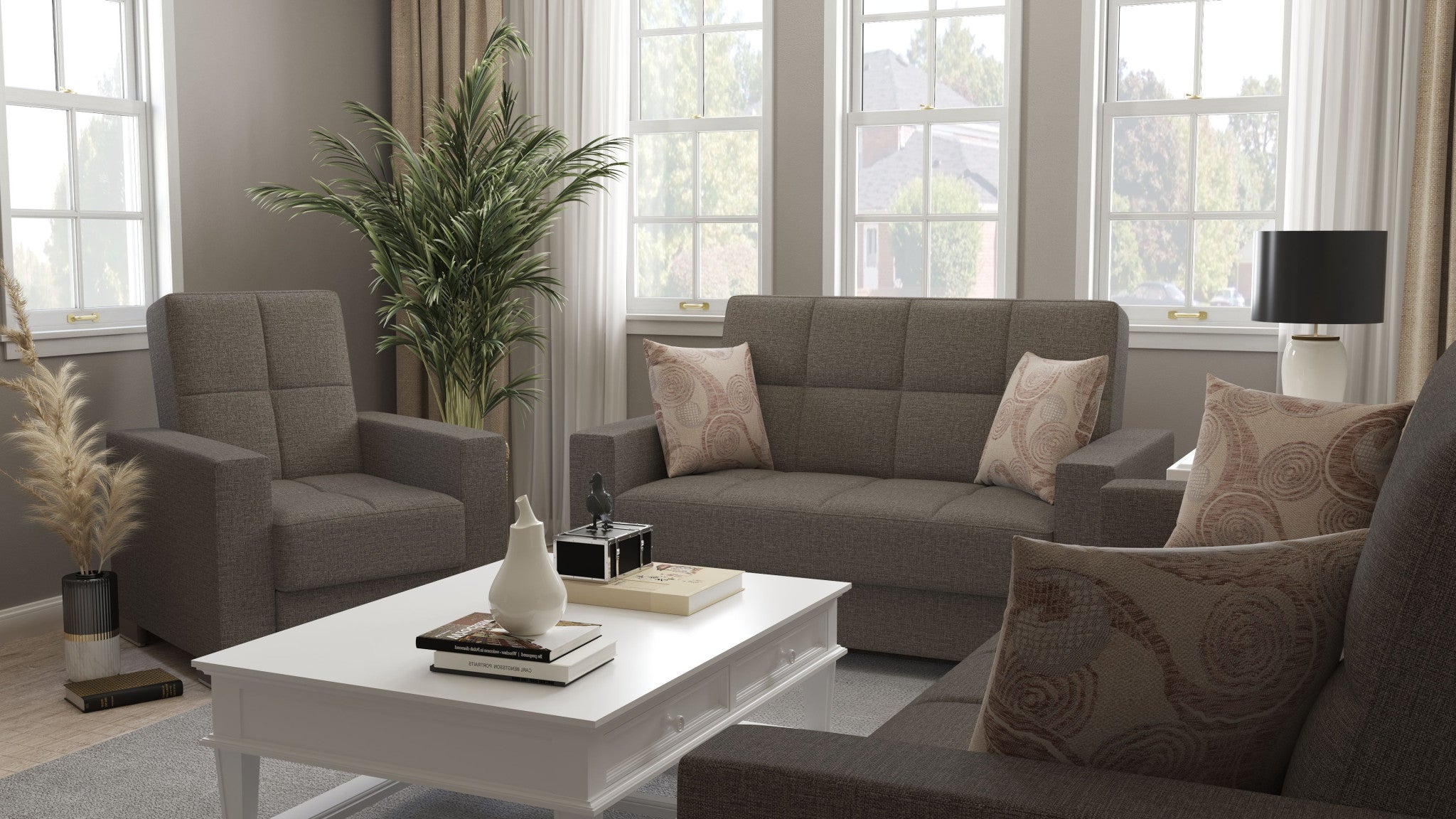 - Features square arms with leather accents for added sophistication.