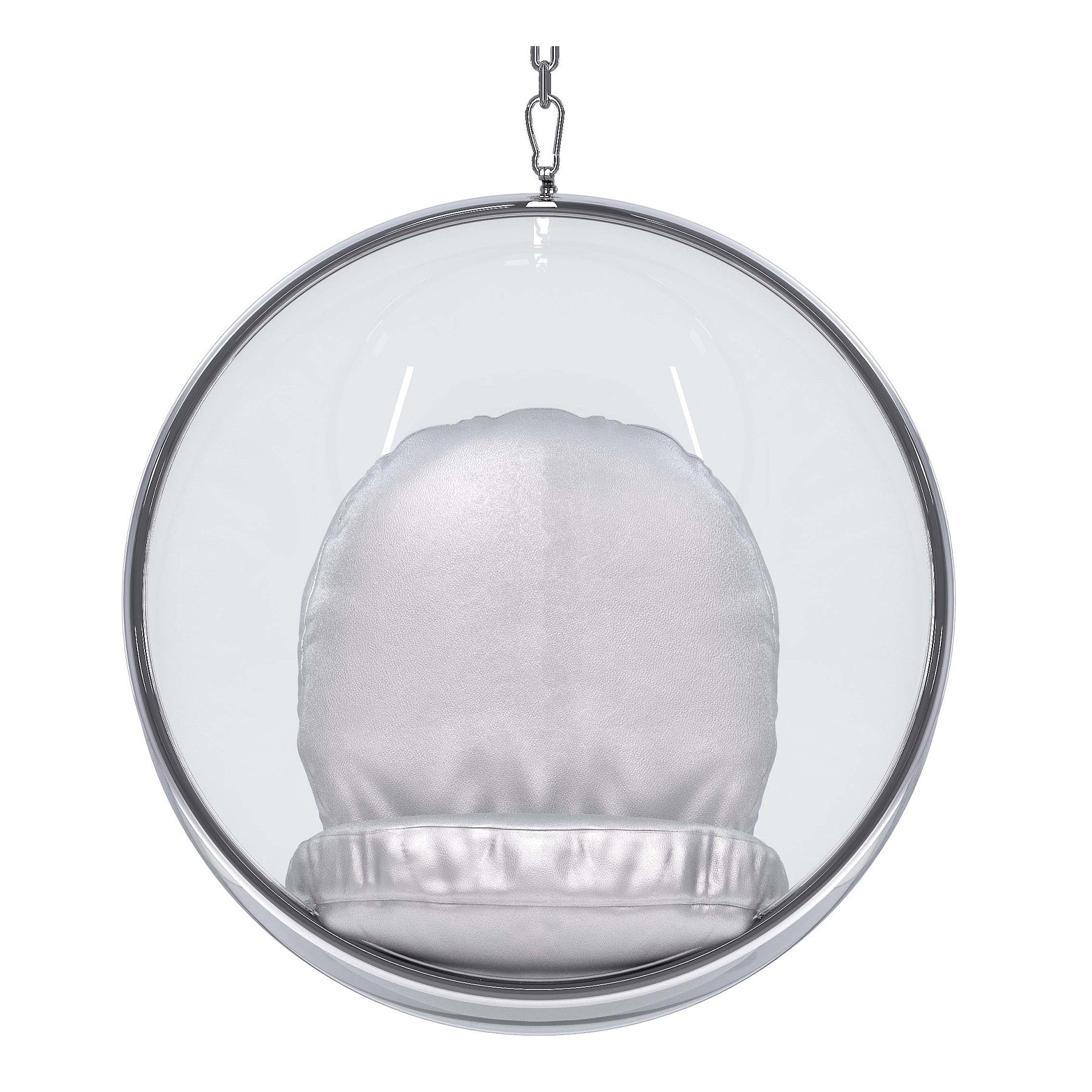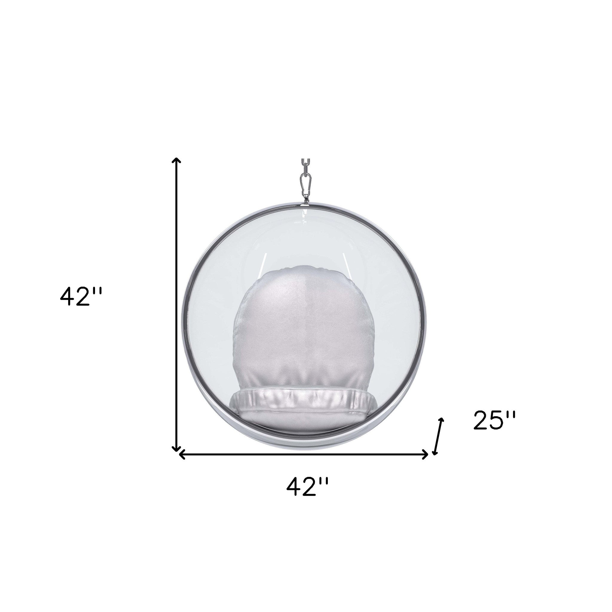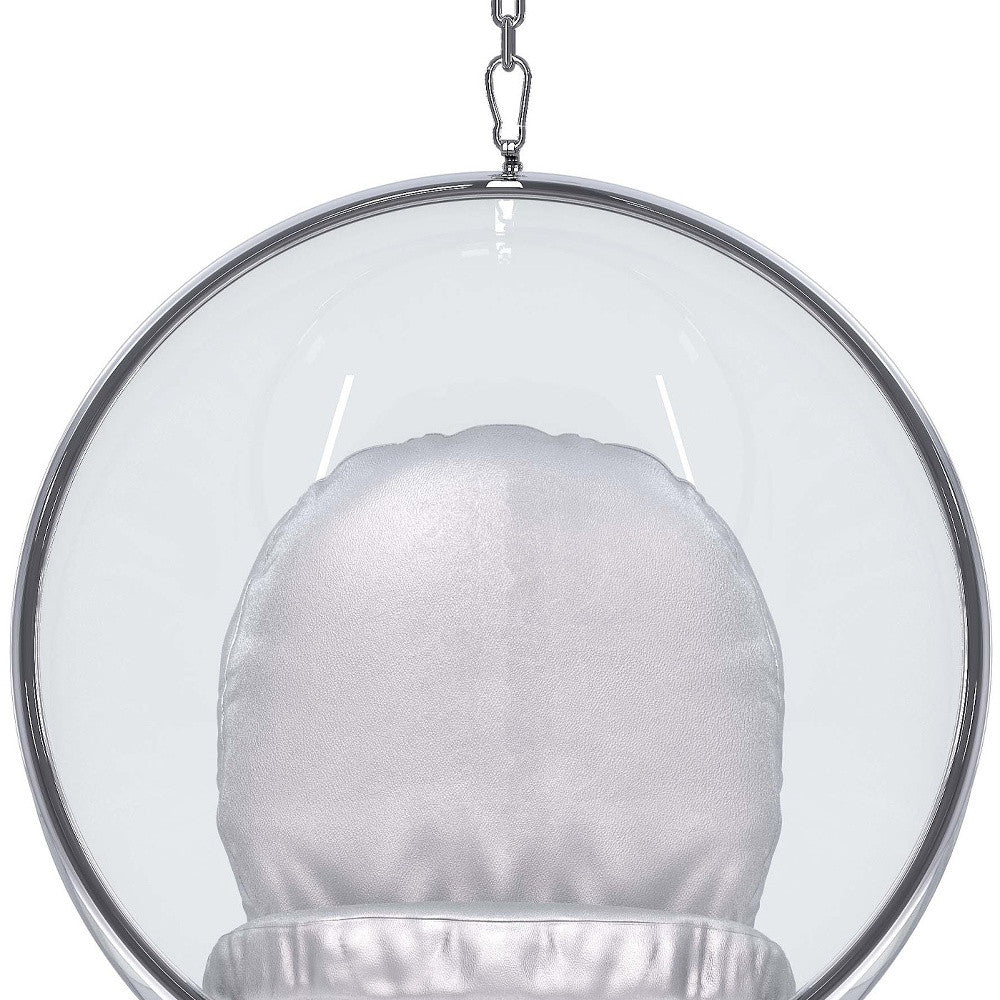 - Clear acrylic hanging egg bubble chair with stainless steel chain and faux leather upholstered cushions.