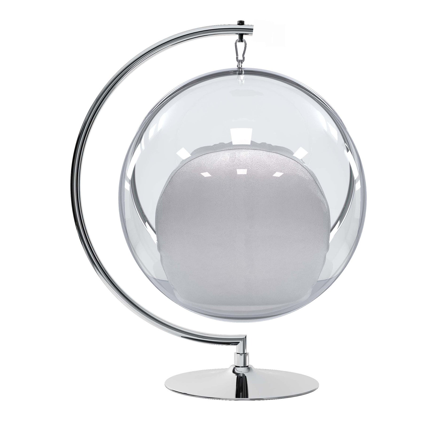 - Clear acrylic egg bubble chair with stainless steel pedestal holder and chain includes faux leather upholstered cushions.