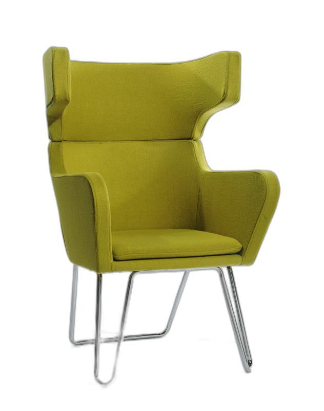 - Blue accent chair with silver legs.
