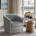 Elevate your decor with a refined, comfortable swivel chair that blends classic barrel-back styling and modern functionality. Perfect for living rooms, bedrooms, home offices, nurseries, or entryways, this upholstered swivel chair offers supportive comfort, durable construction, and a touch of decorative flair with nailhead trim.