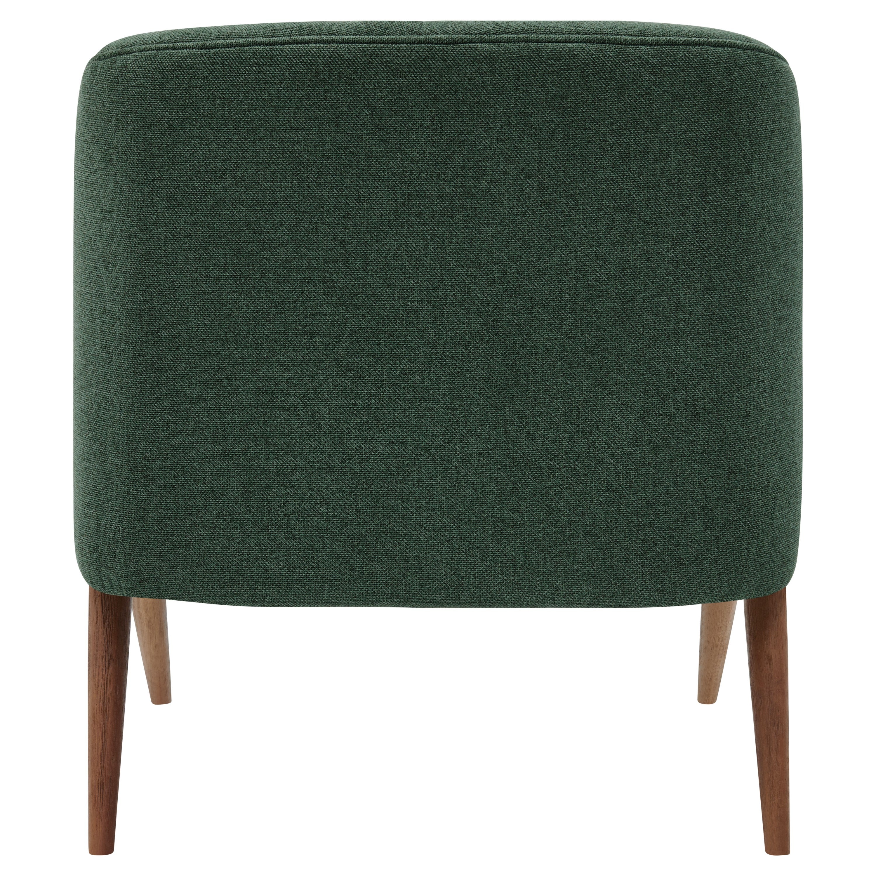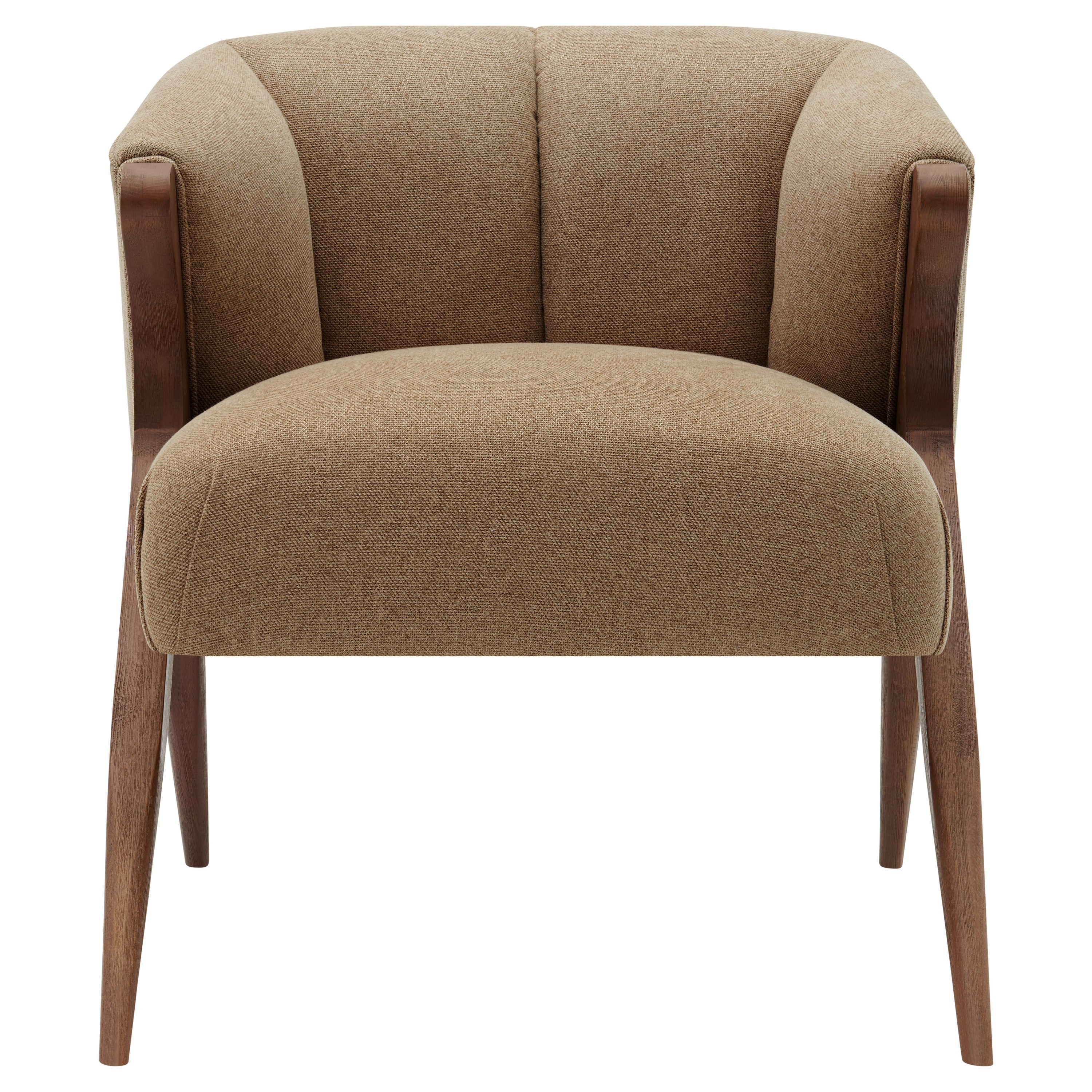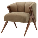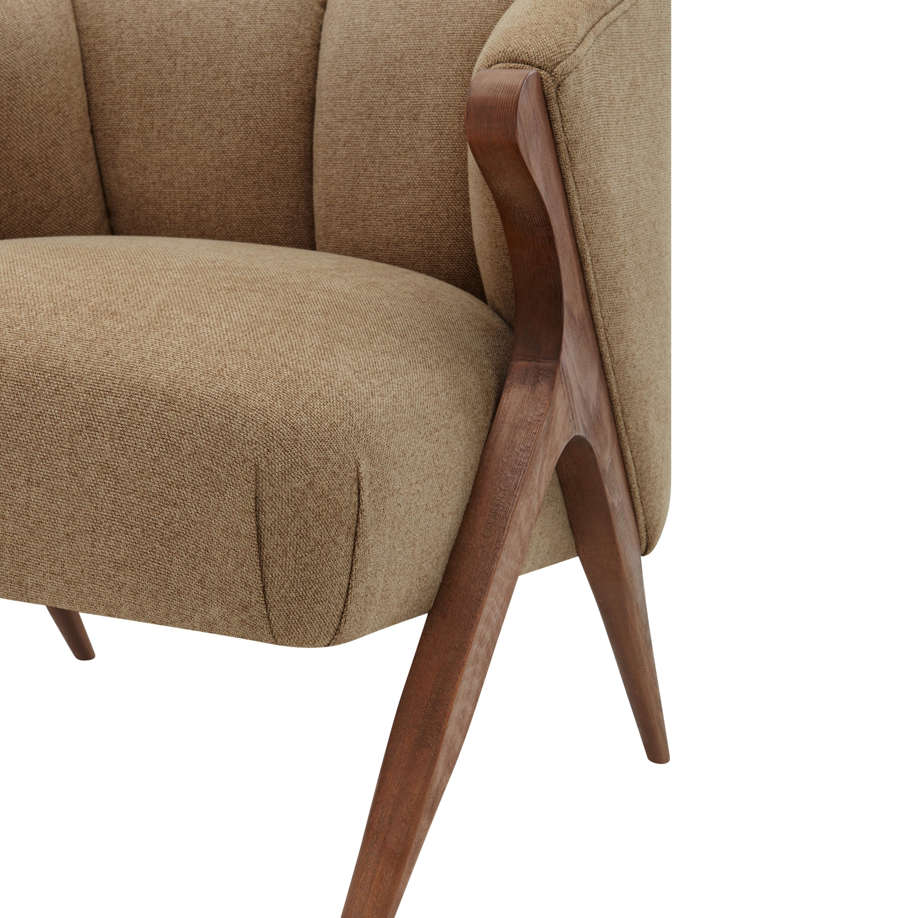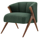 - Feature 1: Sleek with Maximalist tendency, the curved silhouette with bold, sharp lines create a statement accent chair. Constructed of chic polyester upholstery and solid rubber wood legs.