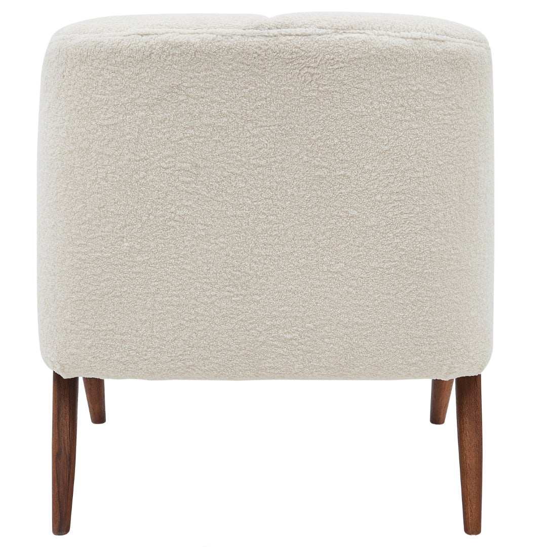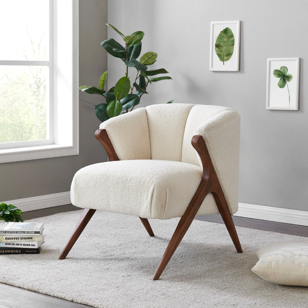 - Feature 1: Sleek in Maximalist tendency, the curved silhouette with bold, sharp lines creates a statement accent chair. The latest boucle polyester fabric offers chic and texture-rich appeal. Solid rubber wood legs provides stability and sturdiness.