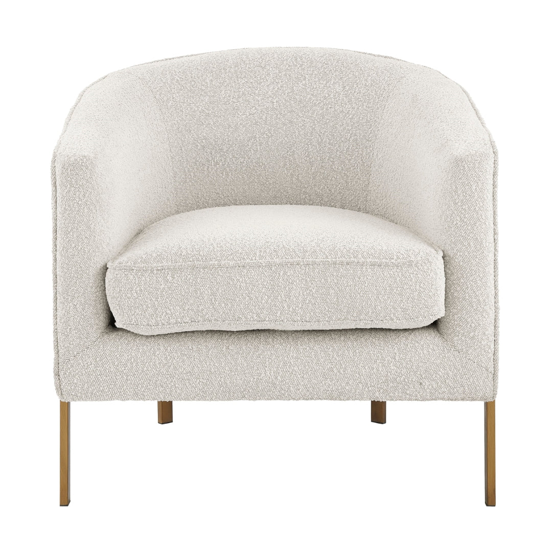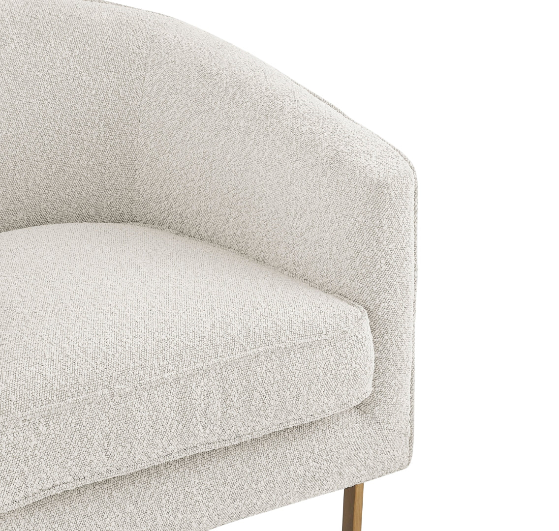 - Feature 1: Charming parlor style accent chair features plush seating in texture-rich boucle polyester upholstery. Antique Gold painted steel frame curves around the chair to complete the sophisticated design. Removable cushion.