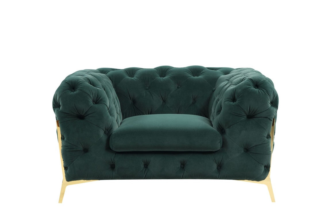 Elevate your living space with the Sheila chair — a glamorous yet versatile statement piece that blends transitional and contemporary styling. Upholstered in sumptuous emerald green velour, this tuxedo-style chair features overstuffed, button-tufted back and arms for luxurious comfort, while polished gold metal legs rise to become an elegant design accent. Ideal as a standalone accent or paired with the matching sofa and loveseat, the Sheila adds color, texture, and refined sparkle to lounges, bedrooms, or reception areas.