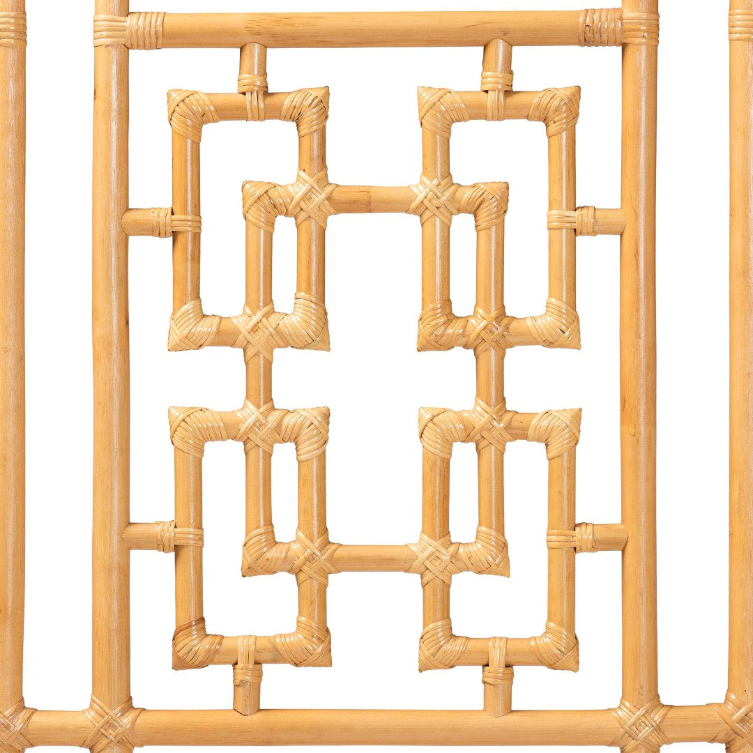 - Openwork panel constructed from rattan pole with Chippendale-inspired geometric pattern for visual interest and light flow