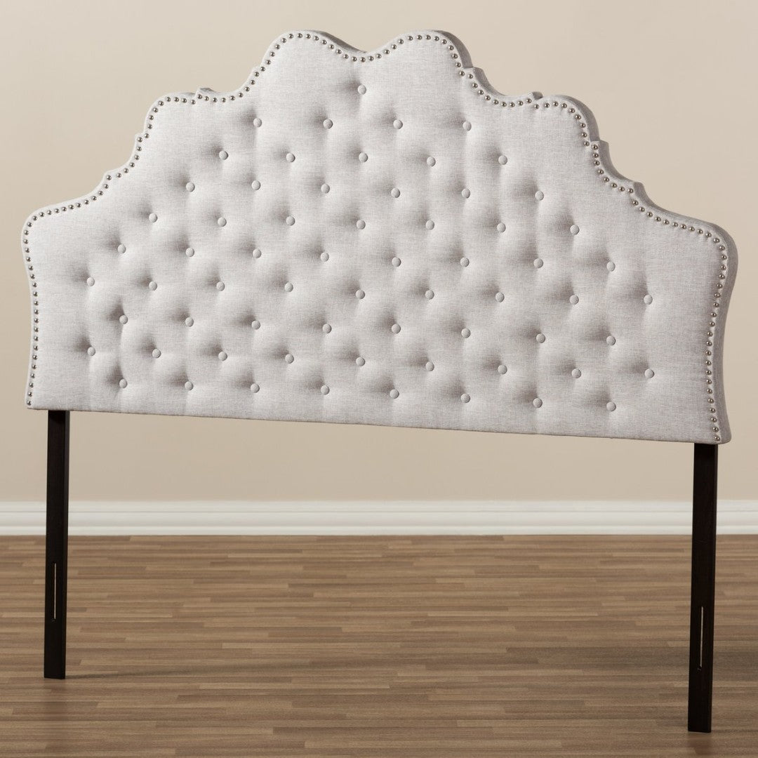 Elevate your bedroom with the Hilda upholstered headboard — a refined blend of modern curves and classic glamour. Padded for comfort and finished in a durable greyish beige (also available in dark grey), this queen-size headboard features elegant button tufting and silver nailhead trim that catch the eye while providing a supportive backrest for reading or relaxing. Built with solid rubberwood mounting posts and an MDF frame, Hilda combines stability with a soft, inviting silhouette for a polished focal point in contemporary interiors.