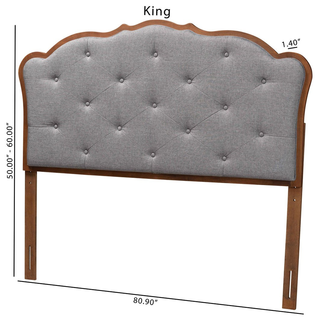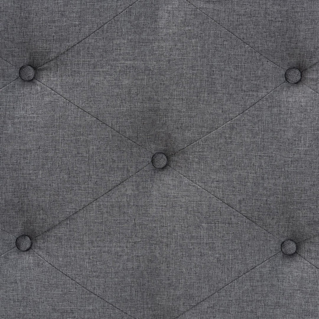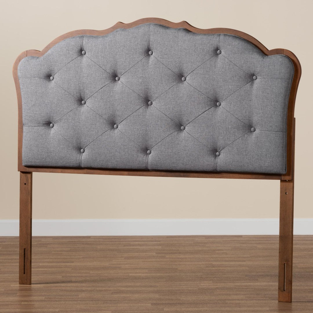 Invite timeless elegance into your bedroom with the Leandra headboard — a classic, button-tufted design that combines traditional styling with practical adjustability. Padded with foam and upholstered in soft grey fabric over a warm walnut-brown wood frame, this queen-size headboard creates a refined focal point while offering five height settings to suit your bed and mattress preferences.