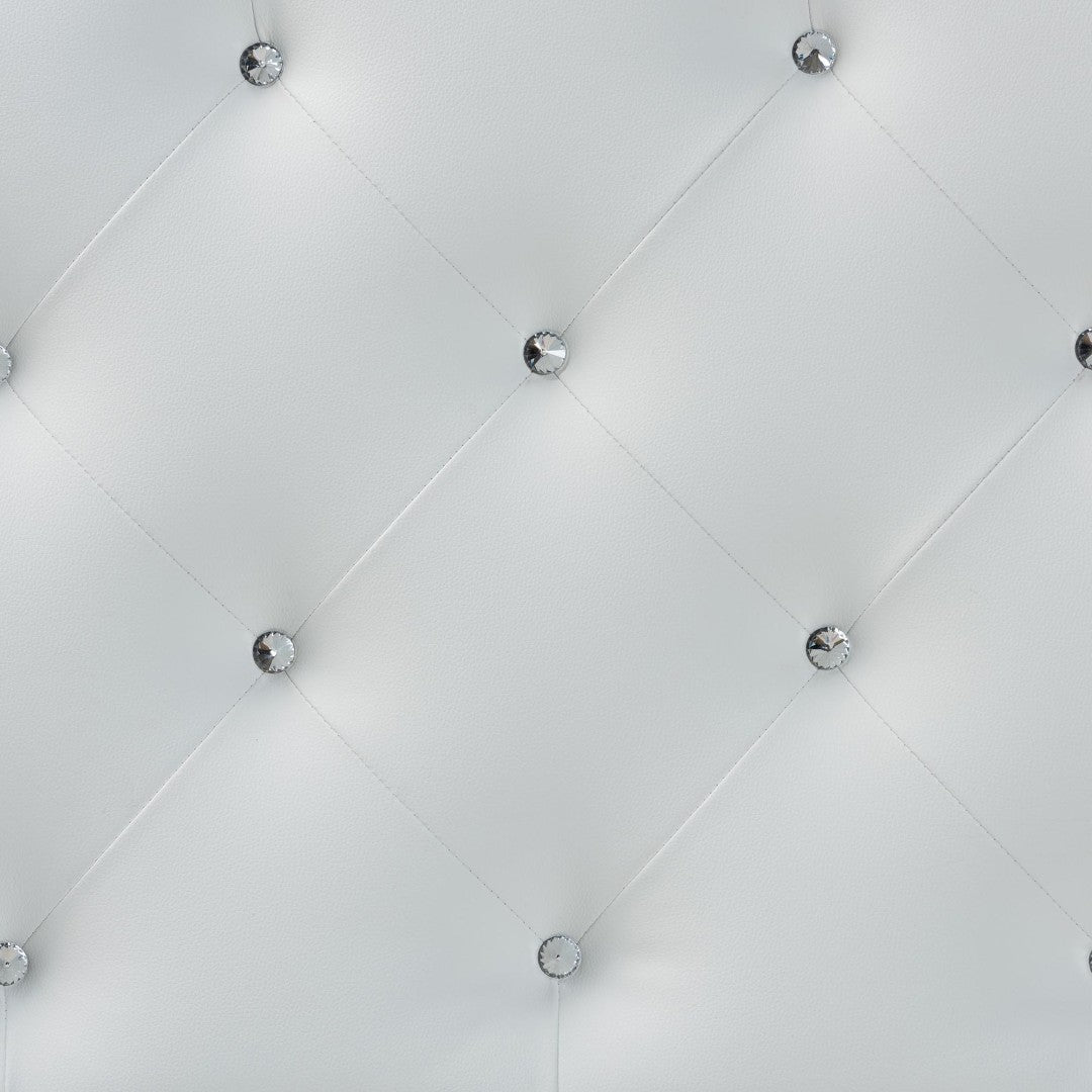 - Upholstery: White faux leather with button tufting and faux-crystal accents for an upscale look