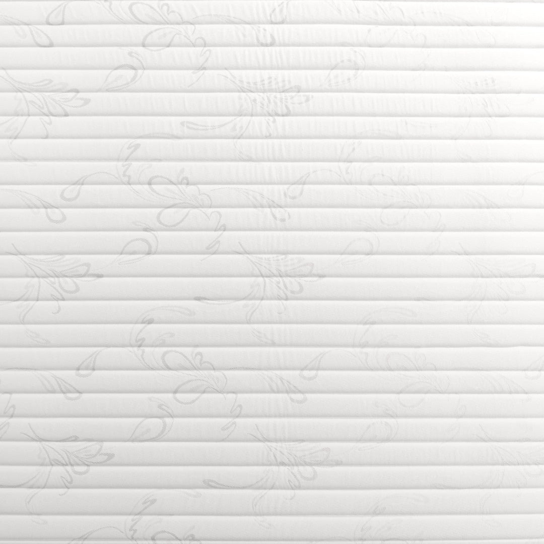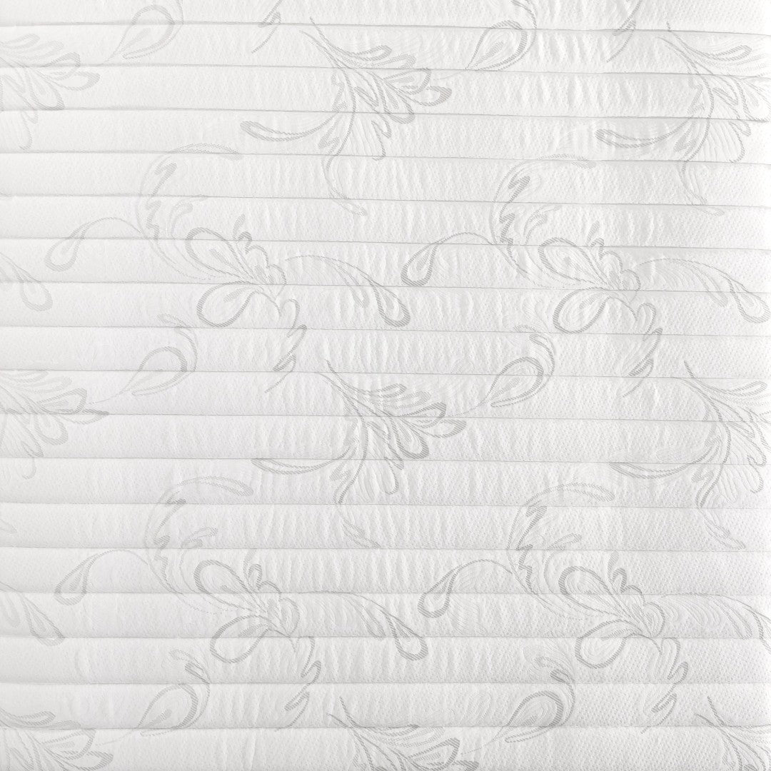 - Materials & color: Fabric cover, foam comfort layers, metal coil system; White/Gray finish