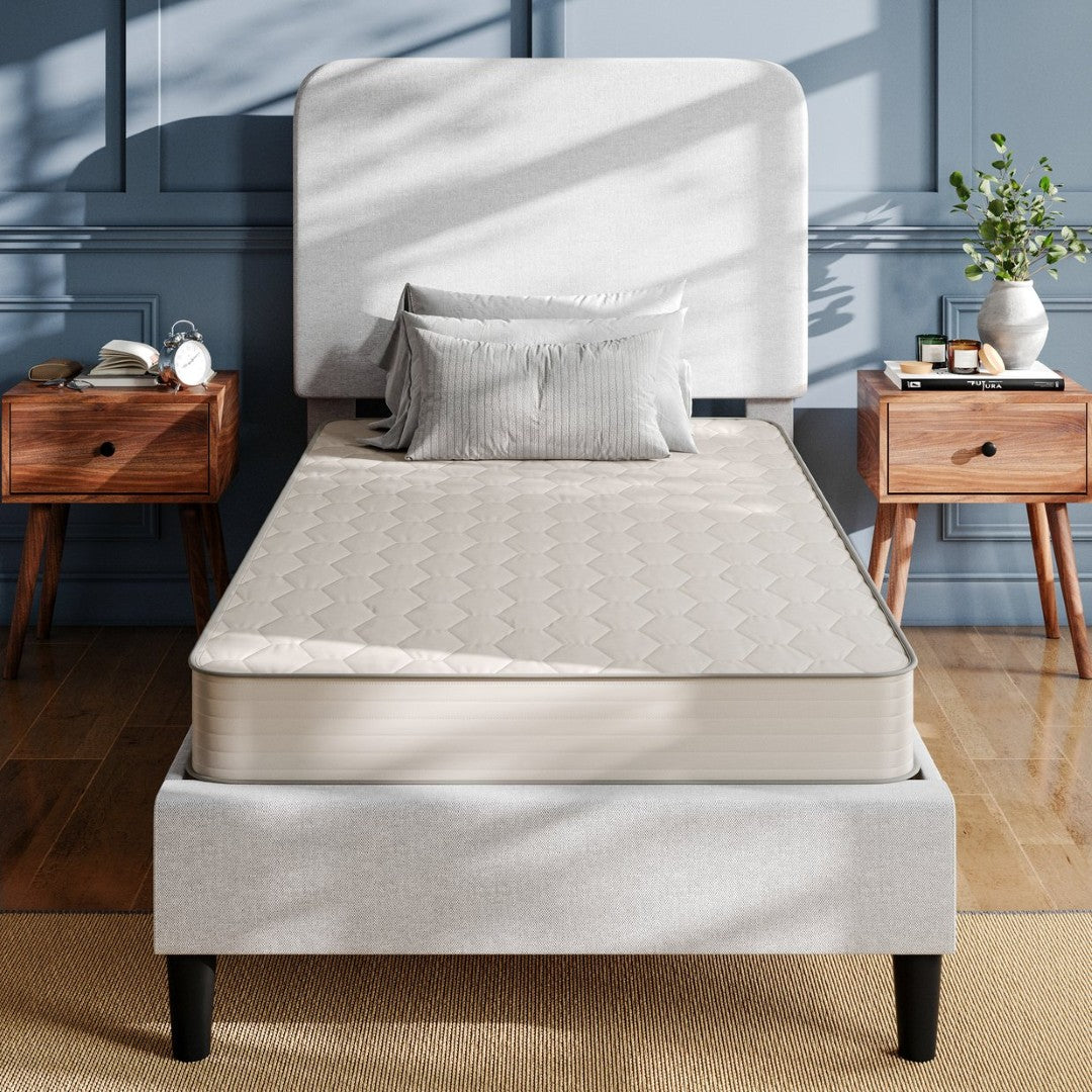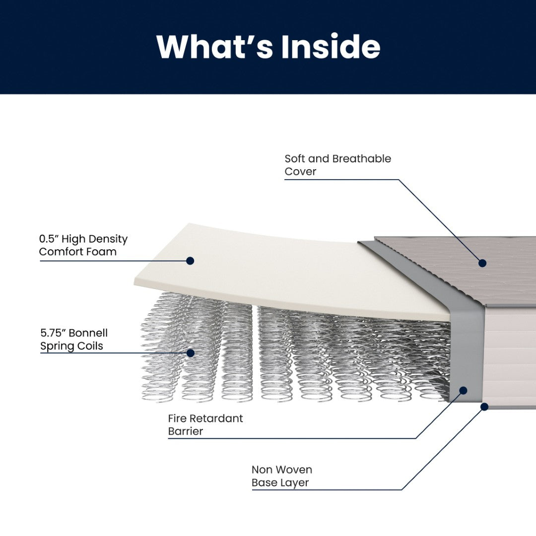 - Hybrid construction: high-density CertiPUR‑US certified foam layers over heavy-gauge tempered steel innerspring coils for balanced comfort and support